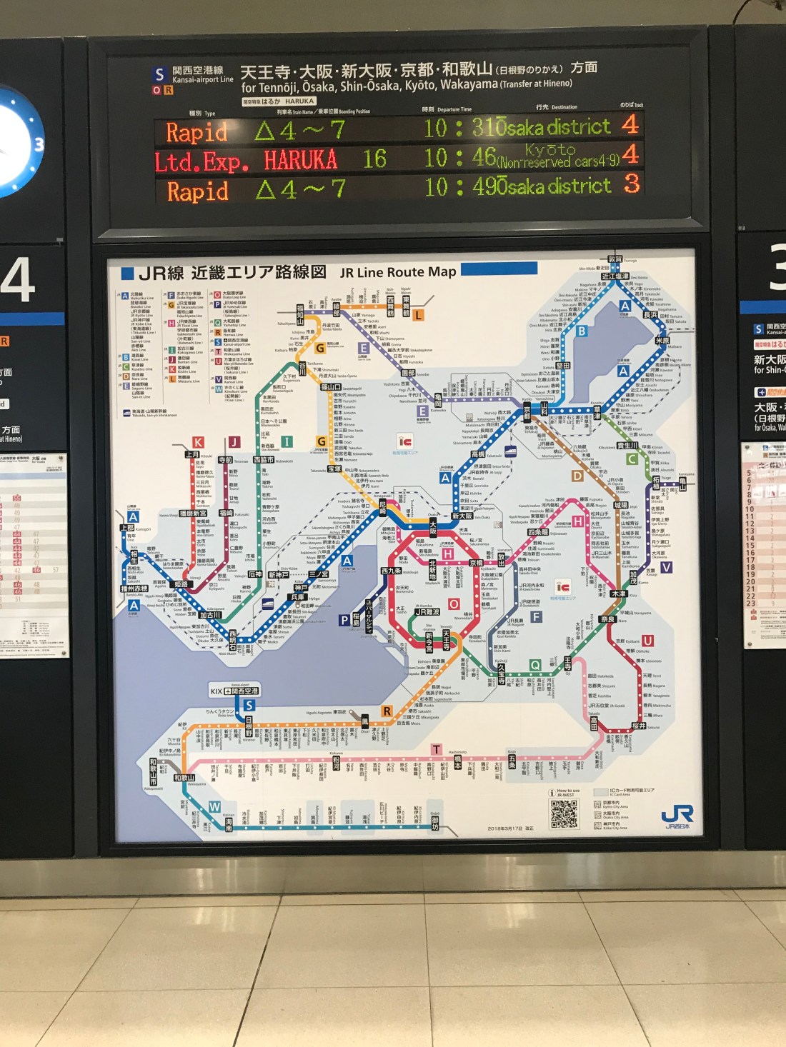 After 19 hours of flying time, I touched down at Kansai Airport. KIX, its airplane code, is located on a man made island about 30 miles south of Osaka Japan Rails (JR) station. If you are a train enthusiast, Japan is the place for you. Photos of the Lufthansa flight at the moment of landing and the JR map of the Kansai region (Osaka, Kyoto, Kobe, Okayama, and Wakayama) are provided below. I boarded the 10:46 Haruka for Kyoto.