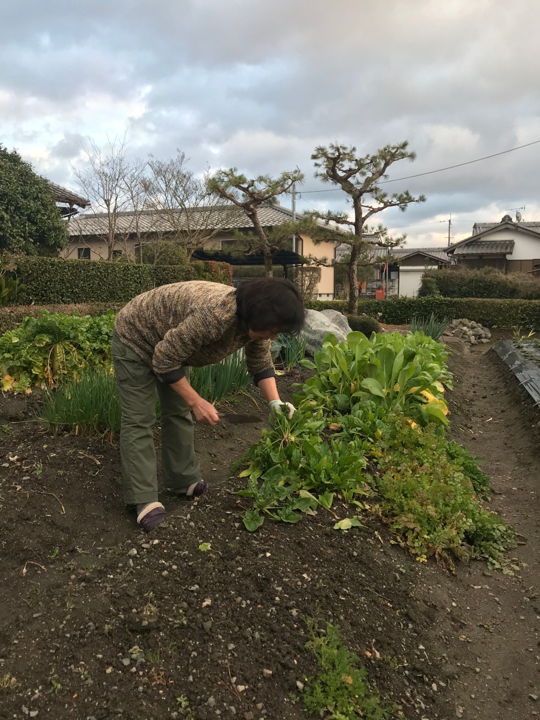 Fukiko met me at the Kameoka train station. She made lunch and dinner which included scallions and spinach from her own garden – that is farm to table! That’s Fukiko digging up spinach from her garden.