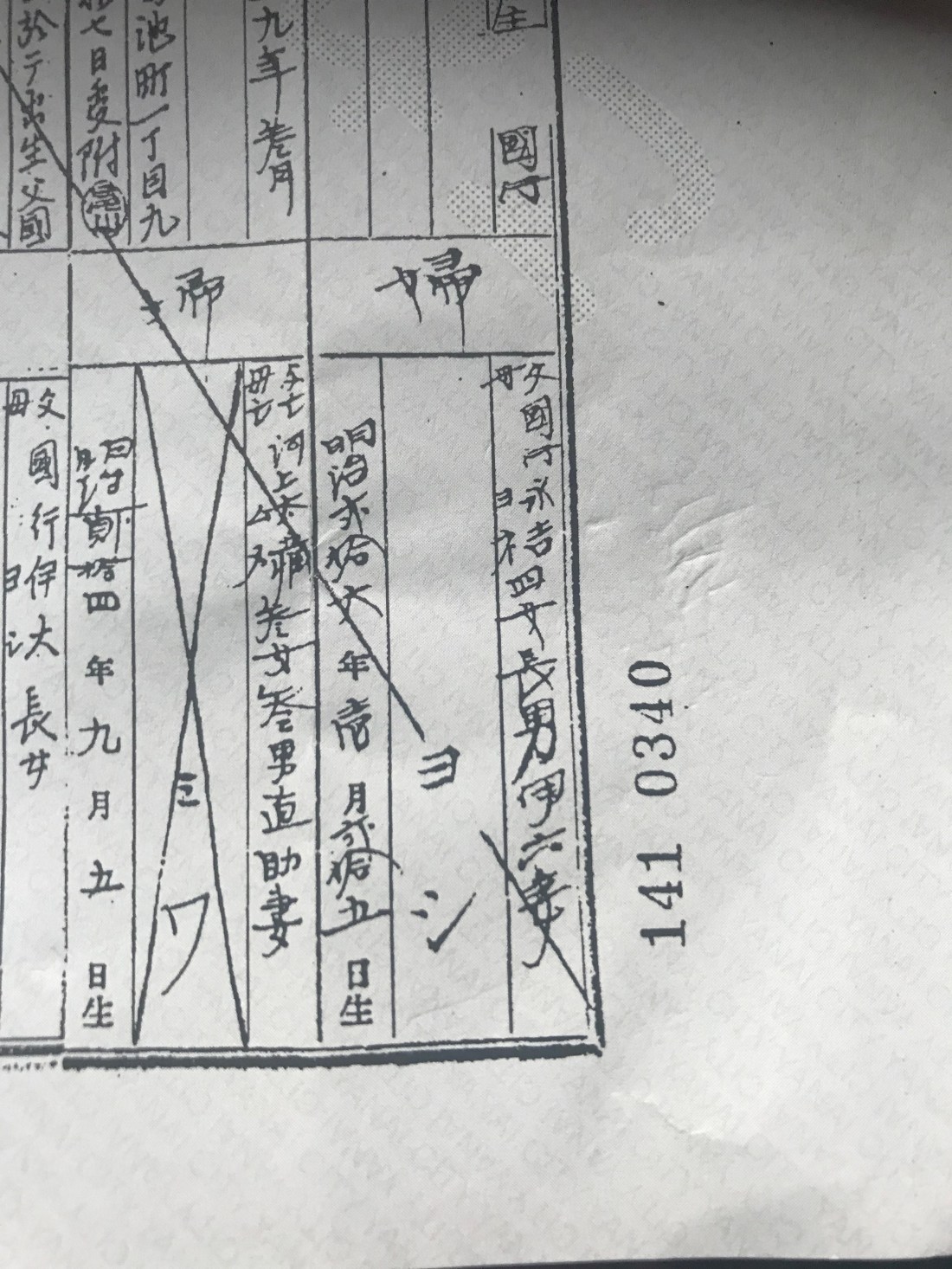 Yoshi, my maternal grandmother, was the fourth daughter and the youngest of seven children. Iroku, my grandfather, was the first born son in a family of seven. His brother, Tomozuchi, who migrated to the US and known to my sister and me, was the fourth son and youngest in his family. Another surprise was that my mother is recorded in this koseki meaning that she was a Japanese citizen! I had no indeed because my grandparents never wanted to talk about the past. The kosekis only went back as far as 1830, the birth year of my maternal second great grandfather (Kuniyuki Dikki-zo) who relocated from Kobe.
