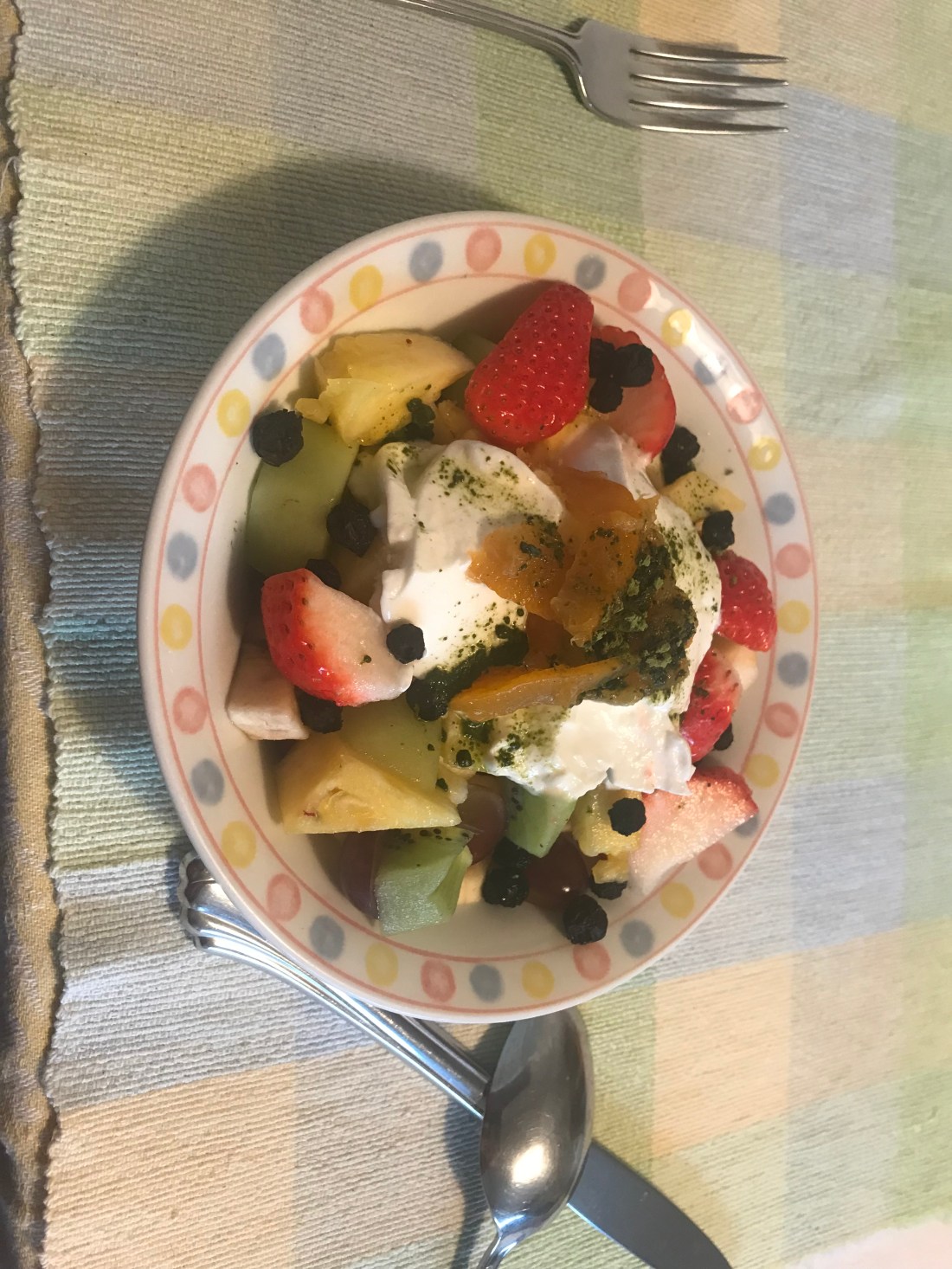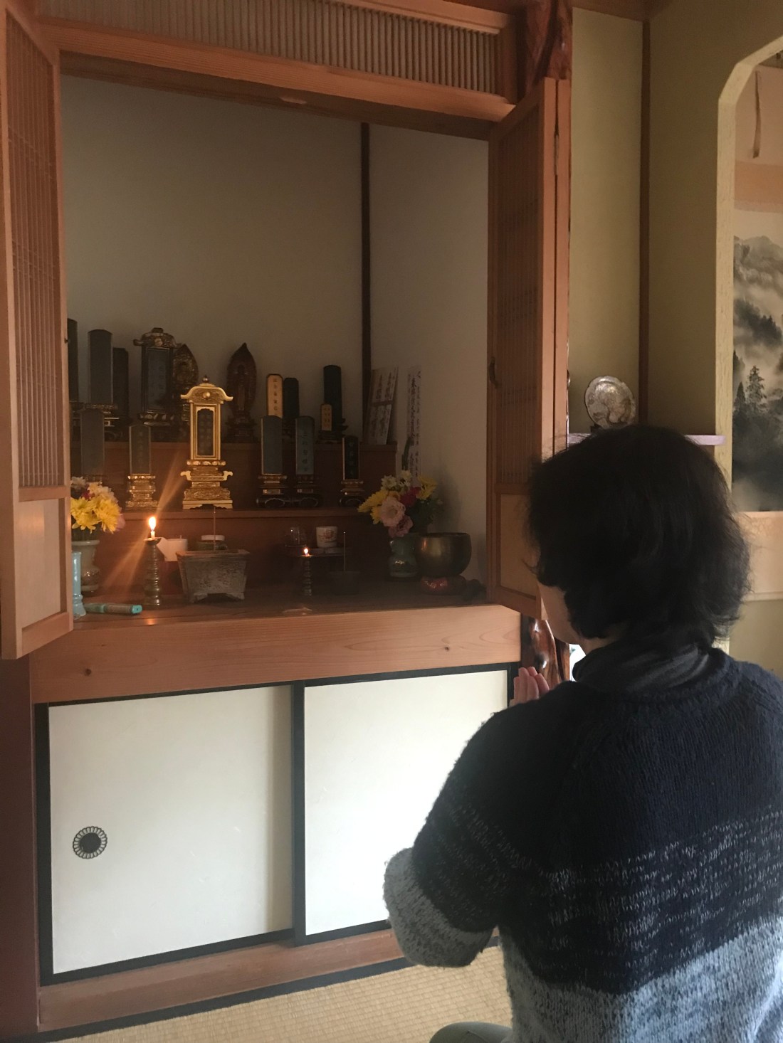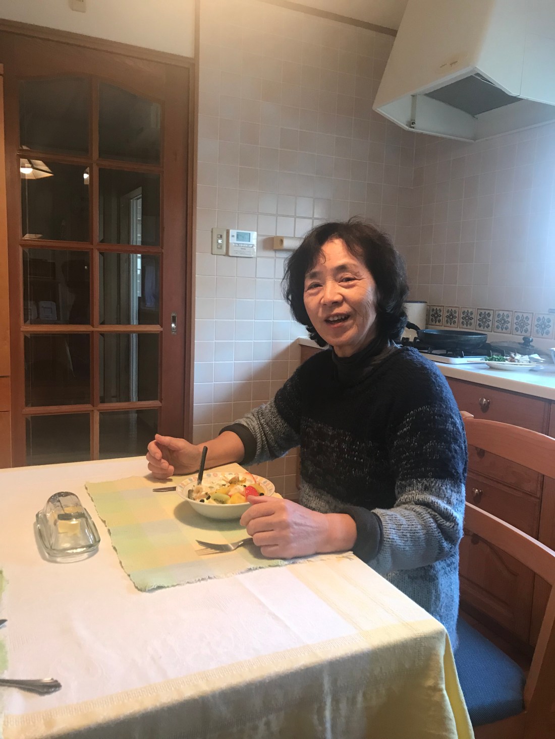 This morning before breakfast, Fukiko invited me to pray at her family’s shrine – a daily ritual in traditional Japanese families. Afterwards breakfast started with a fruit salad topped with homemade yogurt, dried orange peels and blueberries. Voila, a photo of Fukiko.