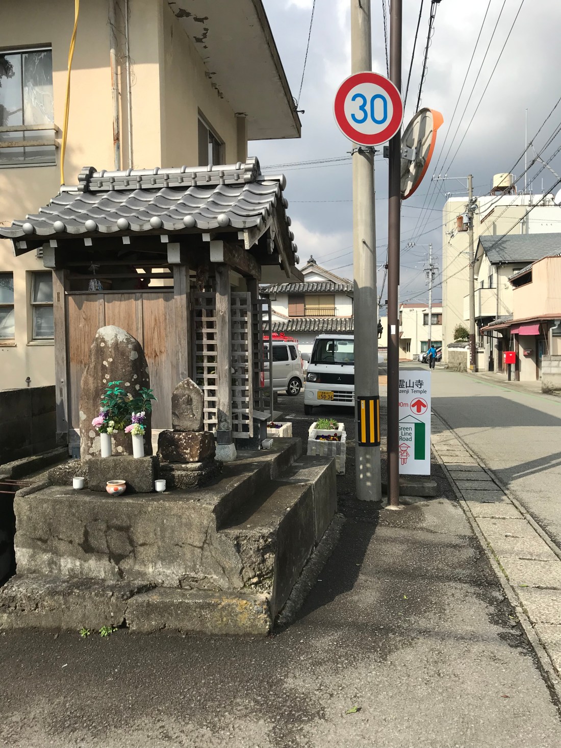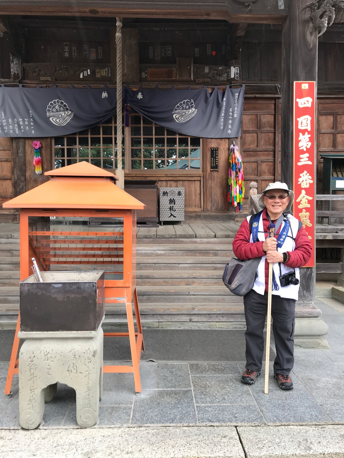 After buying my henro clothing and signature book, I went outside of the shop to put on my vest and prayer stole. It was an odd moment. I felt that I was in a uniform separating me from others. At Temple 1, I was the only one in uniform. But soon that feeling abated. I met others wearing white, all with the pilgrim’s stole, almost all walking with ritual staff. Here I am at Temple 3.