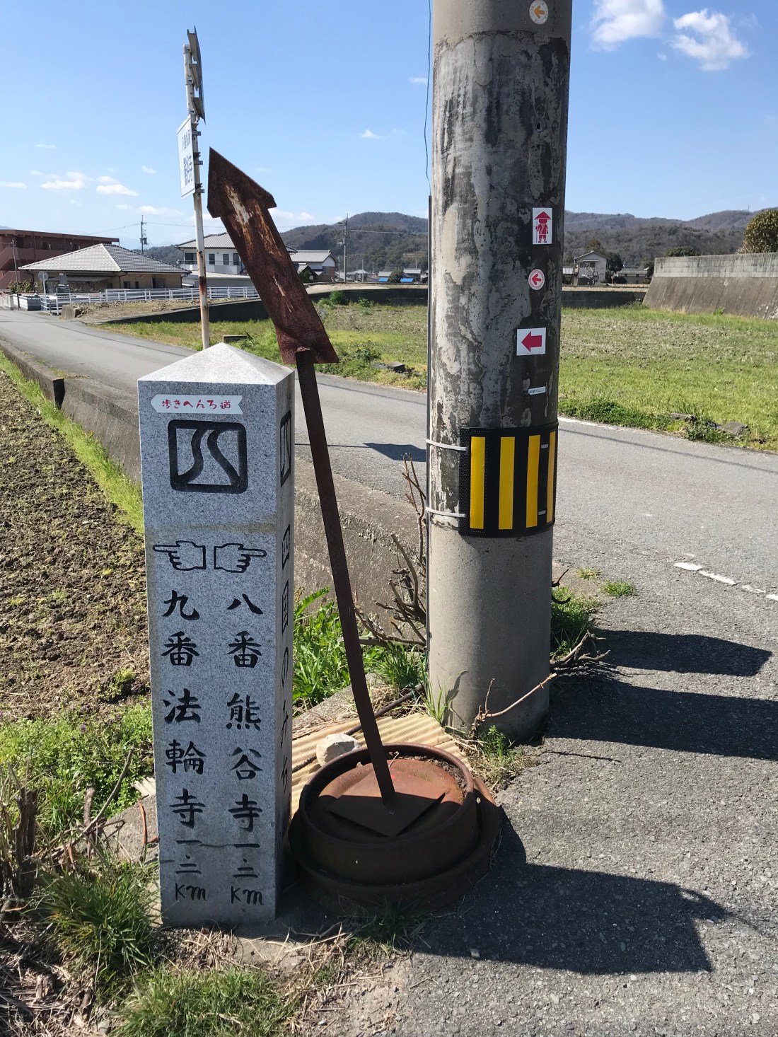 Besides having a superb set of maps from my 2018 guidebook (totally accurate from roads — no Waze for the walker — to noting important services like accommodations, 7-11s, and toilet facilities), the henro association has marked the path with elegant as well as barely noticeable signs. One has to keep looking for these signs at critical junctions and intersections while enjoying the view in order to stay on course. Missing one may be costly to the wear and tear on the body. Here are some examples. Thank you from a grateful henro.