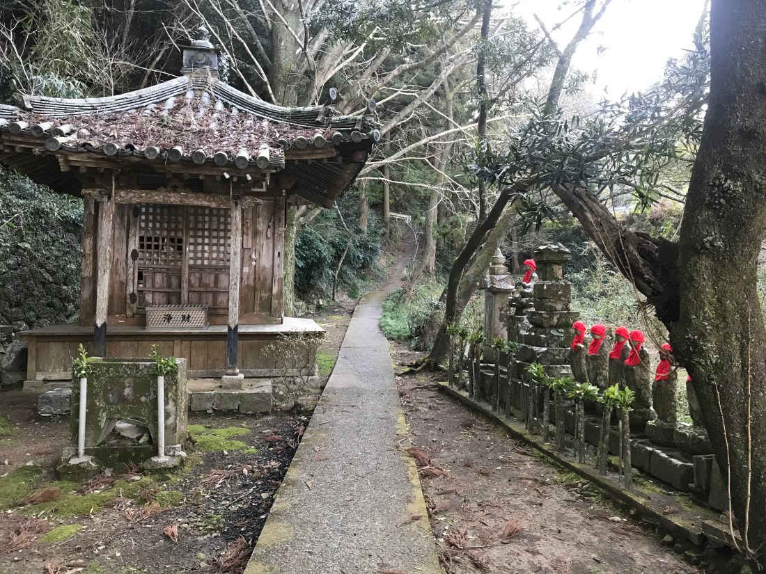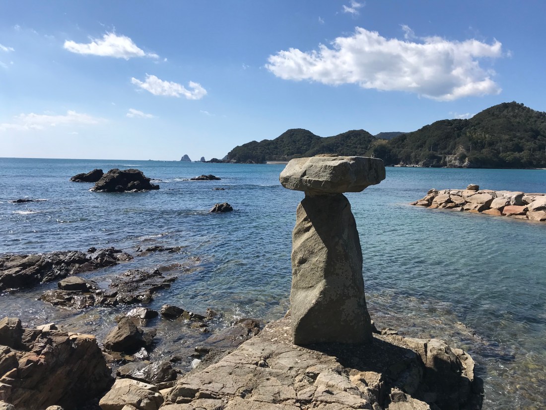 The first image shows a small shrine about 2 miles from the start. Shortly thereafter I met up with Obata-San who was one the diners from the previous evening. We shared the moment when we first saw the Pacific Ocean. The stone sculpture gives one the impression of Kukai.