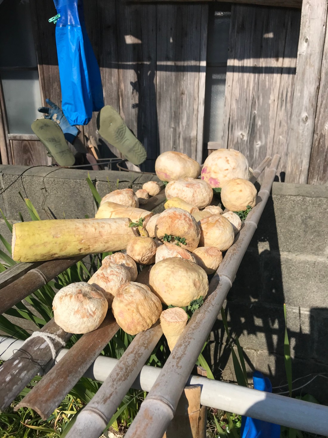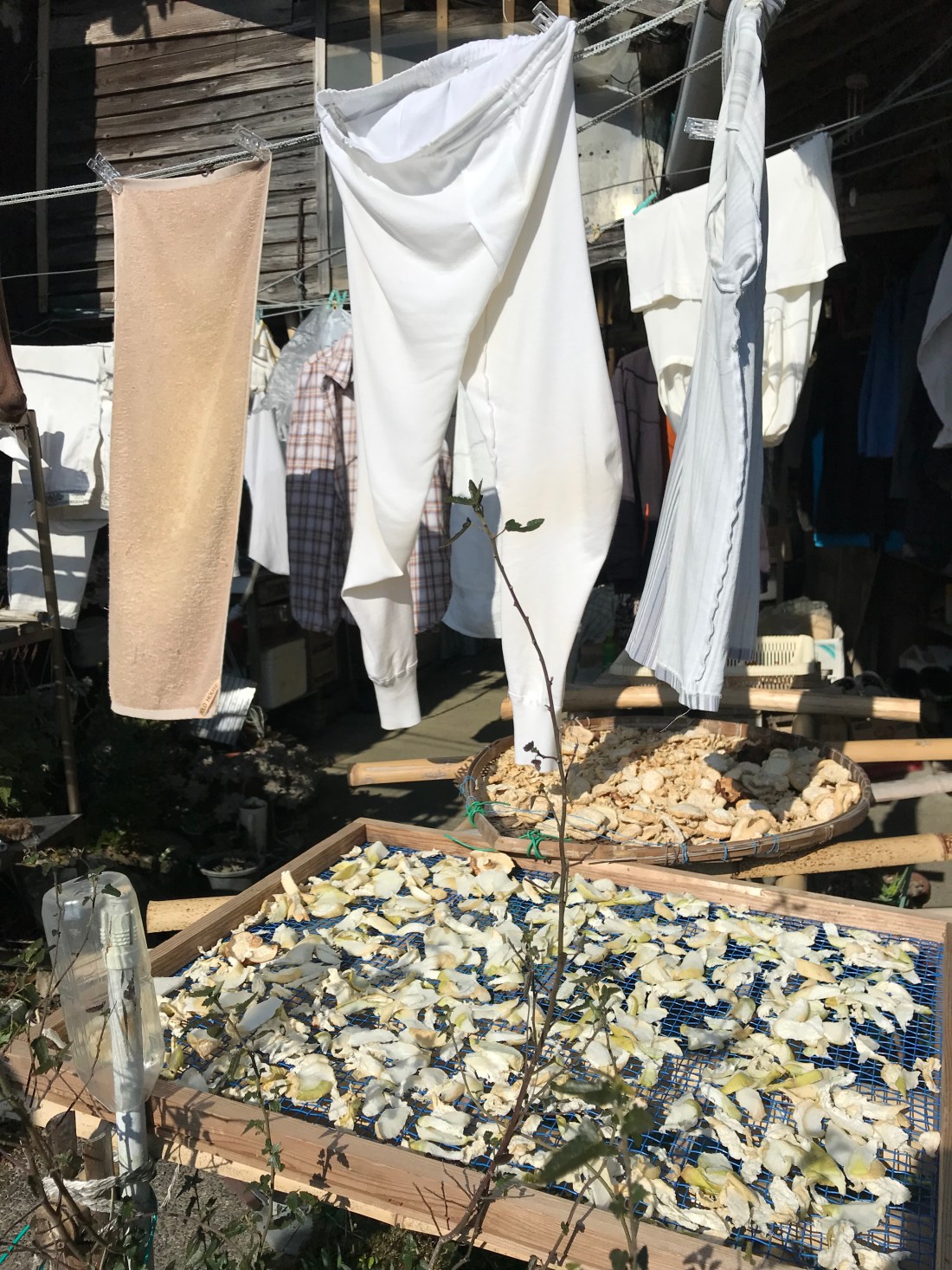 We also passed by a house drying shiitake mushrooms and radishes. No industrial equipment here – just drying along with one’s clothes.