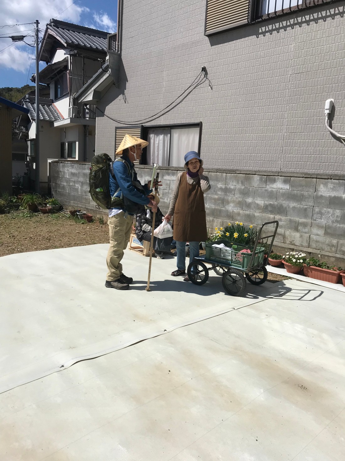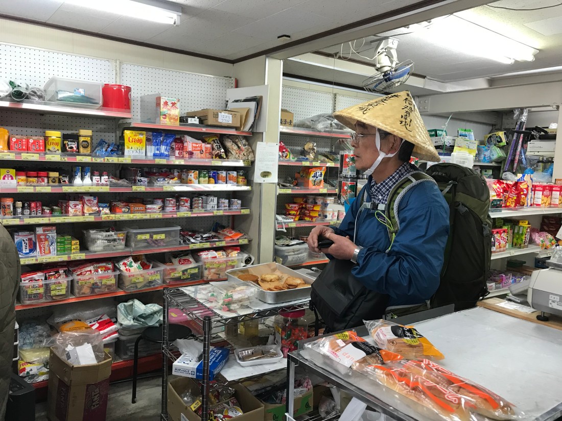 One of the tasks that pilgrims have to do is find places that sell lunches. 7-11 or Lawson (a competing convenience store chain) sell food items. Here is Obata-San asking where we can find food. No convenience stores on our path that day. I also included a photo of a lunch that I bought at 7-11 from a previous day. Sushi like my grandmother used to make.
