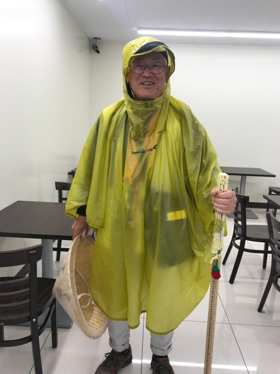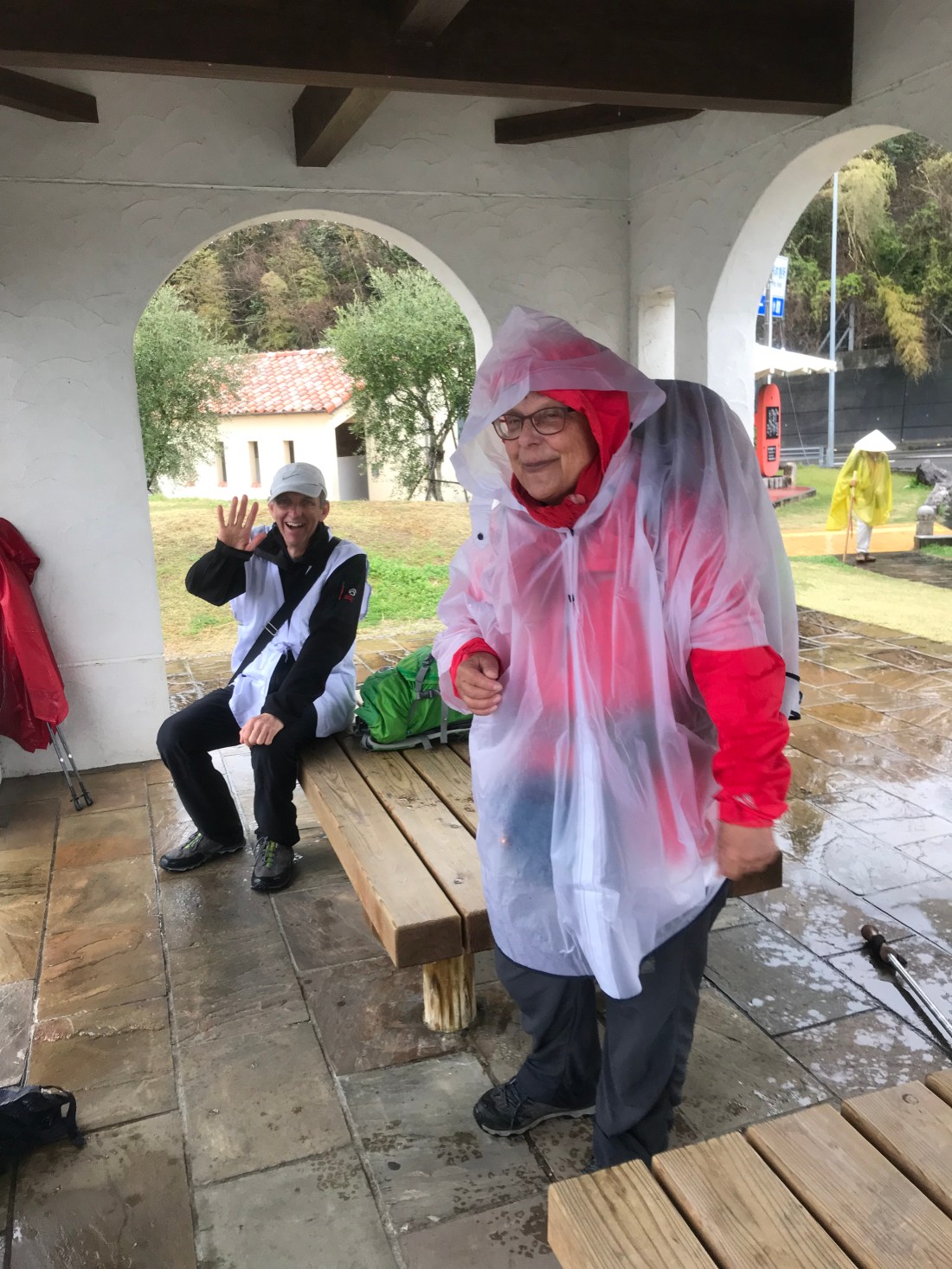 Aoyama-san and I walked 17 miles, almost all in steady rain. Before this pilgrimage, I don’t think that I walked in the rain further than from building to car. I took days off from training when it rained. Now, it seems natural though my fellow walkers and I would prefer dry weather. The weather is what it is and we have to make progress along the path. Below are photos of Monique (Joseph is waving in the background – today was his 64th tanjobi birthday, Ayoyama-san, and moi in our rain gear.