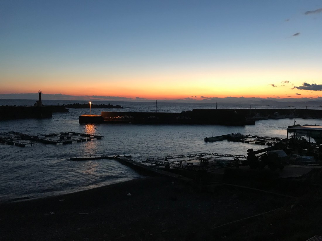 The rain creates its own mood and beauty. We stopped several times to take photos. The first is of the mountains near Aki City during a momentary break from the rain. The other was taken from the overlook at the Akano rest area. The final image was taken at sunset from the second floor dining area at Sumiyoshi minshuku (a small Japanese inn) after the rain had cleared.