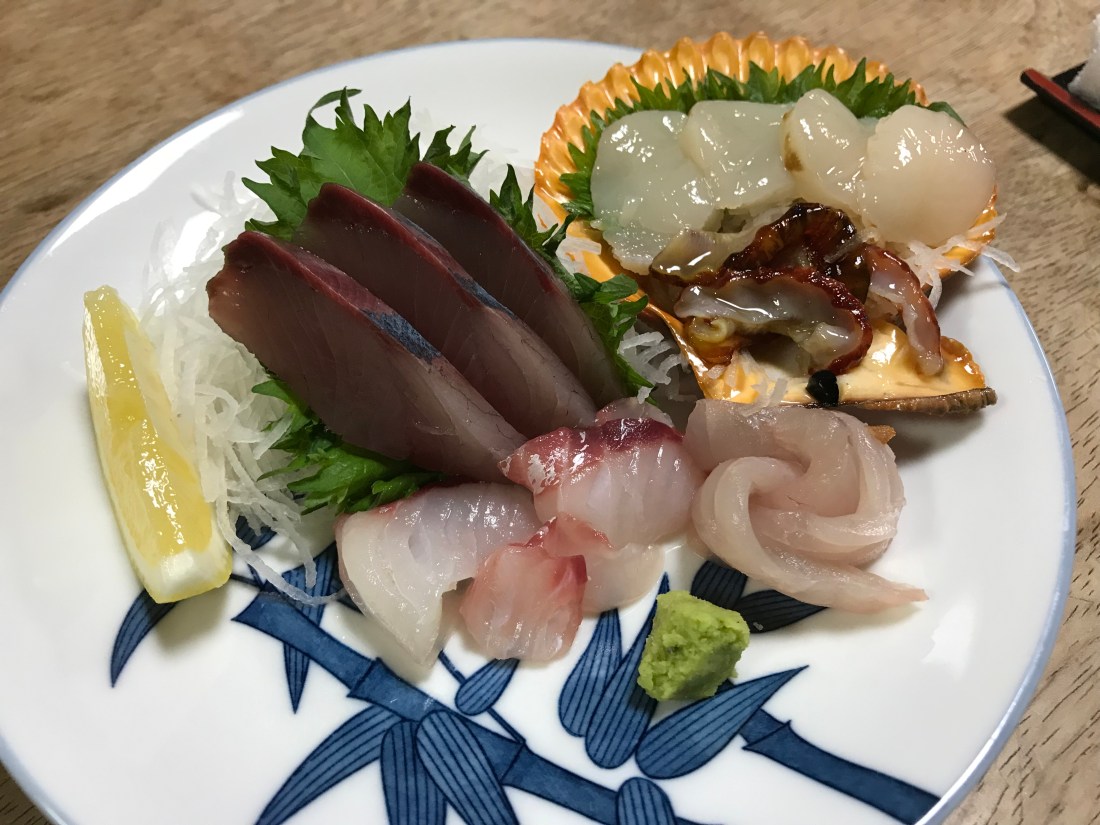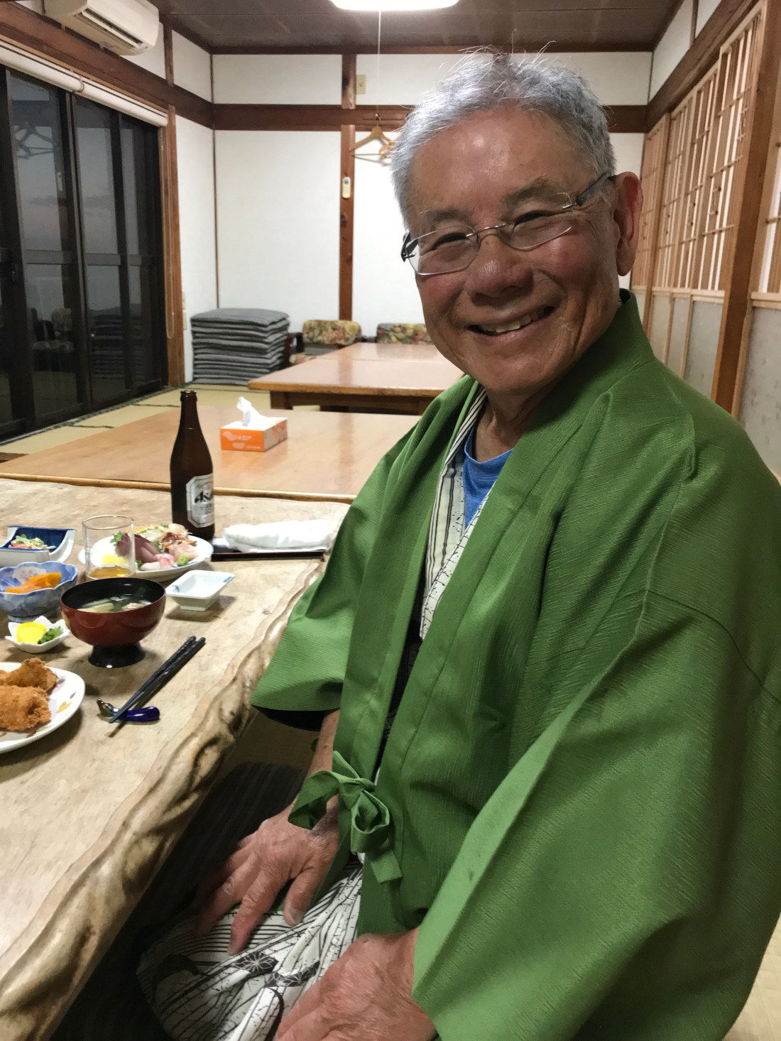 After 10 more miles of walking and a brief stop for lunch (that’s Aoyama-san with a hot dog), we arrived at our minshuku. This one is located right next to the beach. I forgot to mention that several of these minshuku have washing machines available to o-henro. I have taken every opportunity to do laundry. We ended with another fine dinner; we had many more dishes than just the sashimi that is pictured. Every minshuku has a yukata and obi ready for each guest. Surely beats camping on the Appalachian Trail!