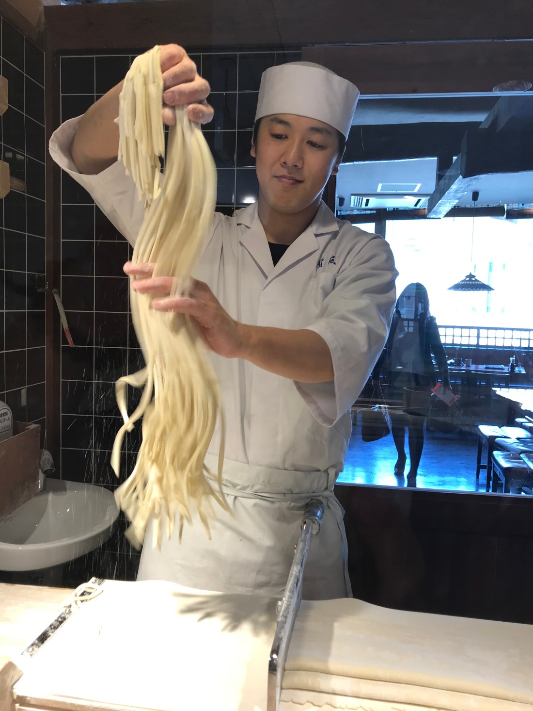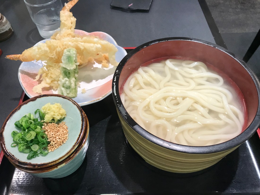 I walked to the city center, a very familiar place because the main train station is located there. Time for lunch. I returned to the restaurant where Sharon and I lunched on our visit for udon, the speciality of Shikoku. It is said that Kukai brought back the recipe for the Shikoku udon when he traveled to China – a simple mix of wheat flour (wheat fields abound in the countryside and even city plots), salt, and water. At the entrance was an udon maker preparing the noodles for lunch. Here’s what I ordered.