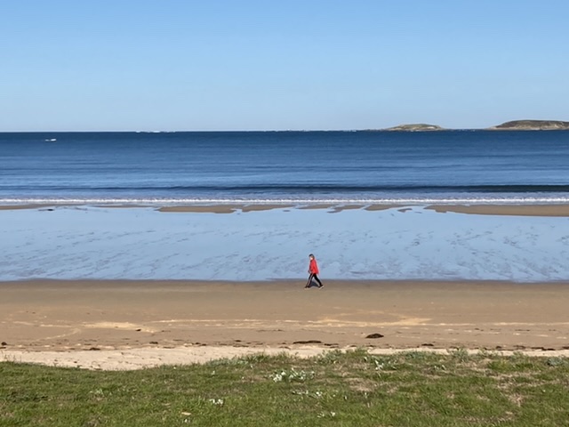 Our route took us along the shoreline of towns with sandy beaches and built up “boardwalks” like the Jersey shore. We passed our first palm tree. We walked on a few beaches; to exit one, we had a climb up a long stairway with steep steps. Glad we did hill training. We also saw an unofficial sign with 115.8 kms posted. I emphasize unofficial.