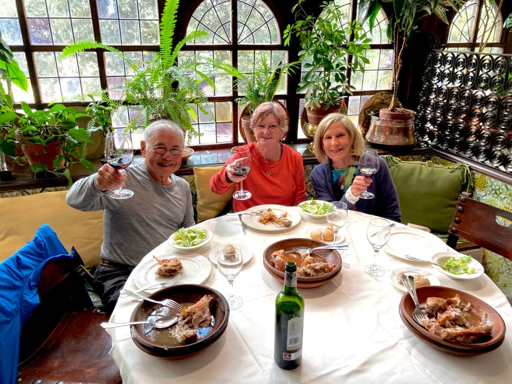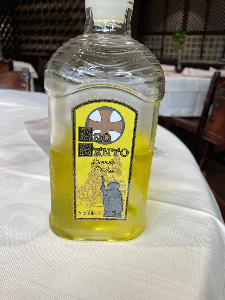 The ladies made it but Pepino was a no show. Too bad for him because indeed, as Rosa said, the roasted lamb cooked over a wood fire was exquisite — the skin was crisp and the meat was fall off the bones moist. Instead of potatoes, we all opted for the small salad of lettuce and onions similar to our sweet Videlia. We chose the house recommended Rioja. To end our meal, Shirley went for the chocolate “egg” while June and I went with the “our renowned puff pasty cake.” A special Galician liquor was offered — note Santiago in gray, right bottom corner, of the label. Maybe an informal imprimatur. I graciously accepted my glass on behalf of the three of us. It tasted like a very mild Chartreuse served chilled. A tray of petit fours were laid on the table. Everyone was happy. I wished them the best on their journey to Santiago. They have three weeks to go.