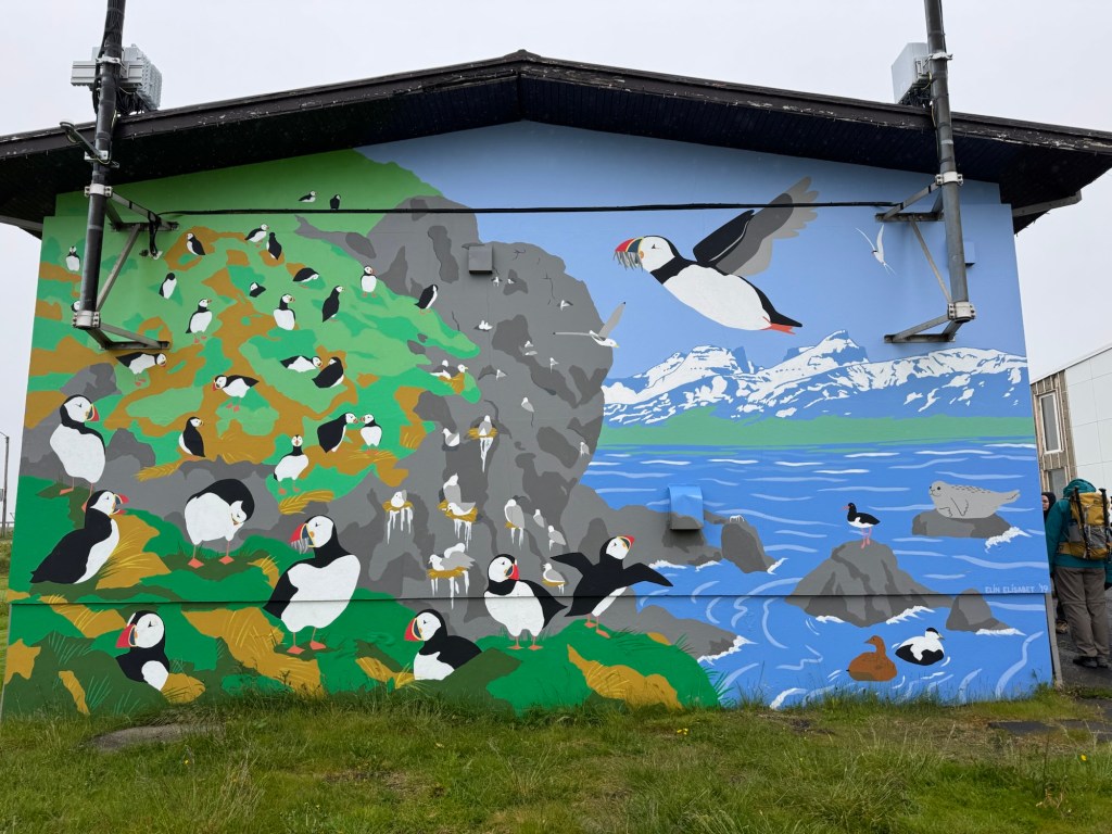 Our rooms were still not ready. So, we continued our town tour that featured a mural showing puffins in all of their glory. Sharon wanted to see live puffins but it wasn’t meant to be. Here were puffins celebrated on the side of a building. Turns out that Eastern Iceland has the largest number of puffins in Iceland. Who knew. One of hikes will start near a rock inundated with puffins. In the end, Laird and I will view the puffins. Perhaps Sharon and Jean will need to make a return visit to Iceland, the next time to the Eastside.