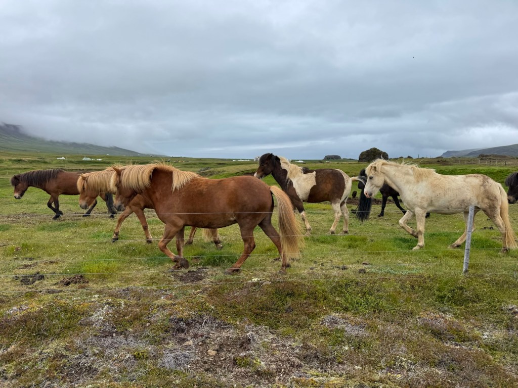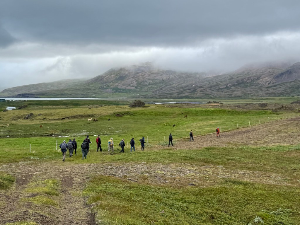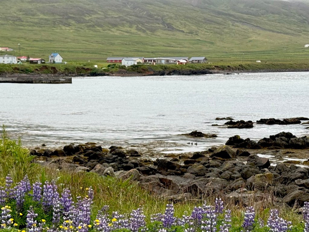 The flight took about 45 minutes almost entirely over clouds. Upon arrival, Mike, our guide from Czecha met us. We were whisked off on a 70 km, one hour ride over a mountain range to Borgarfjordur, our home base for the next five days. Because our rooms weren’t ready at the Alfheimer Guesthouse, we went on a tour of the town that has a permanent population of 100 people. Our hotel, more like a 1960’s US motel, can be seen in distance over the fjord. The rooms are spacious and will serve us breakfast, lunch from offerings at the breakfast buffet that we will eat on our hikes, and dinner. Laird and I tried some drafts from the local craft brew house after dinner — the IPA and the dark lager. Thumbs up. We will visit again for after dinner nightcaps as the days turn into twilight.