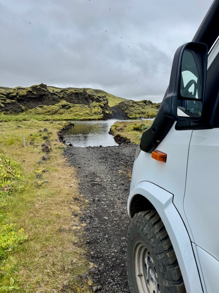 The gravel road presented challenges throughout our day’s journey especially on our returning route. The first photo shows our vehicle approaching a stream to cross. In a more open area, the photo shows the van in the water. Herdis helped stage this photo by dropping off interested photographers on one side of the stream and then re-traced the bus’s path to pick us up. Thank you Herdis.