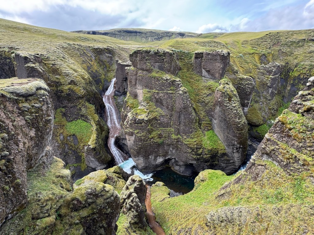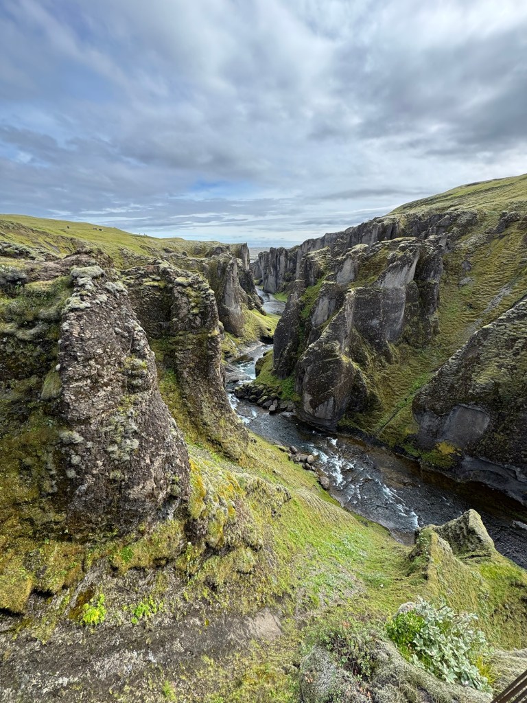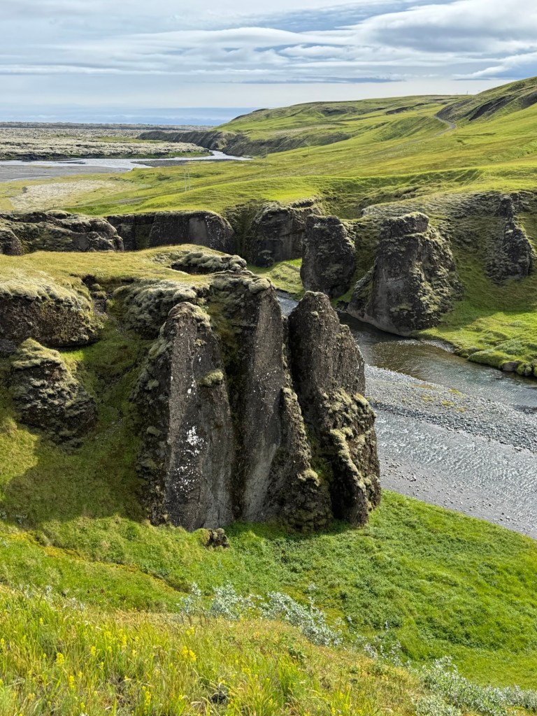 Our final stop was Fjadrargjufur, a most impressive canyon that starts with, guess what, a waterfall and is bounded by massive blocks and columns of stone unlike other canyons we had seen or hiked. I wondered how it would feel if one could walked or waded down the canyon. Laird said that it would ruin photos with the masses of people in them. We also took the high road and speculated about the impact of people throwing rocks at the stone walls, climbing and scrawling graffiti on them. Not a pretty picture. Let’s keep its beauty as is.