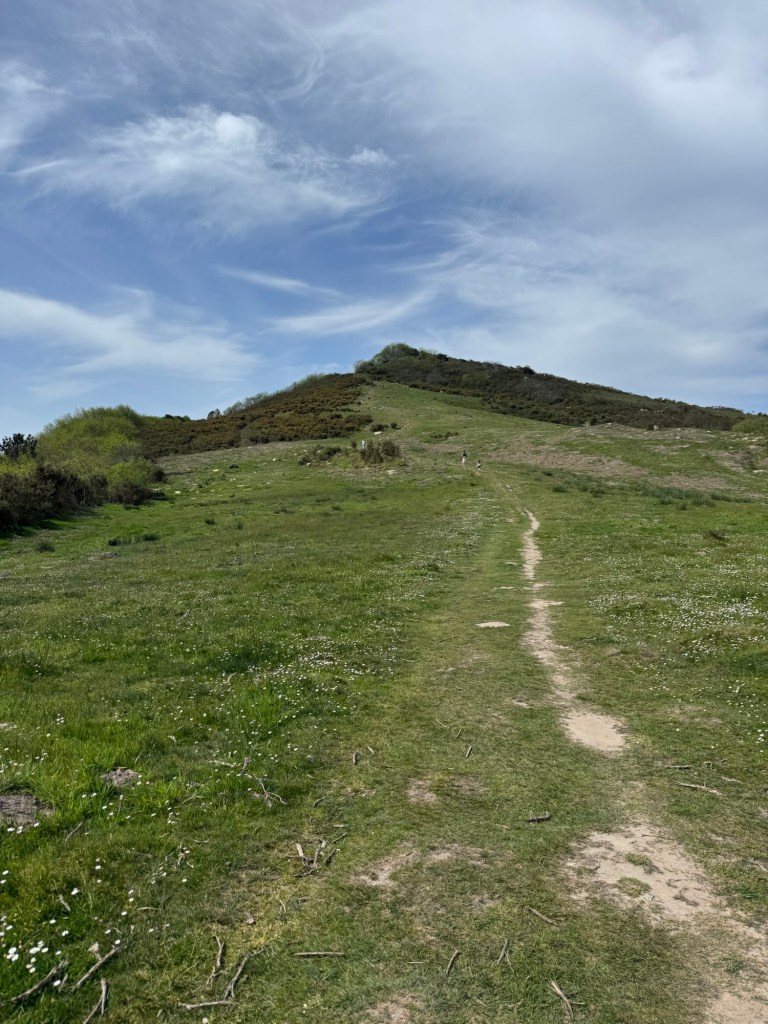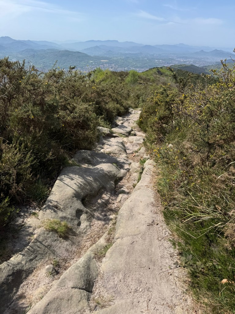 I expected more stretches upward. They were mostly gentle waves of up and downs interspersed with long steep rocky climbs. After the third one, I was pretty much spent and shared some rest time with the communication towers at the top of the ridge. This segment was as hard as the climb over the Pyrenees or the O Cebreio on the Camino Frances and several of the mountains on the Camino Primitivo. Certainly a challenge.