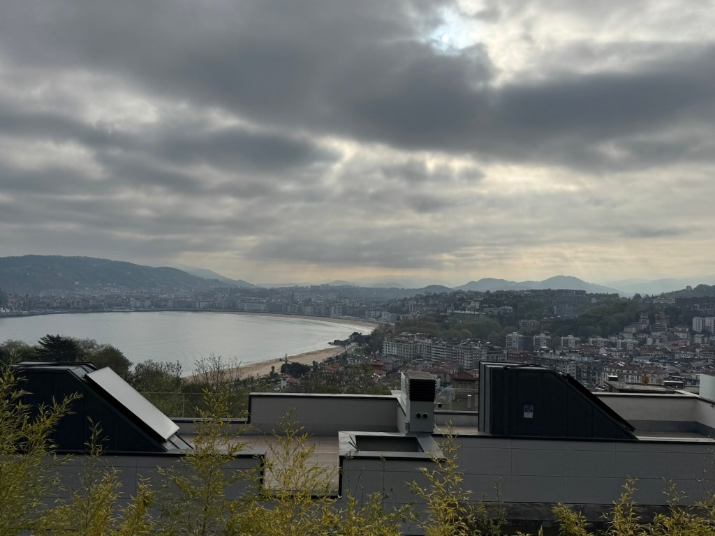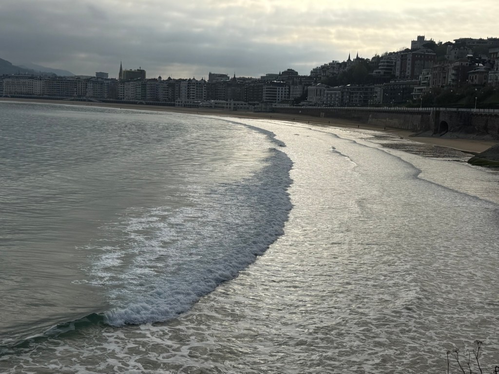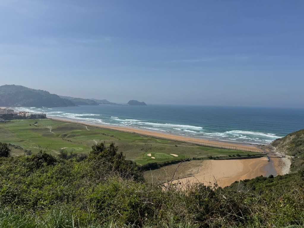 I was now revived for the final four miles to Zarautz which of course had a 500 foot climb up a hill. The view on the other side was the beach at Zarautz. The wind was stiff with clear skies above. What a magnificent site. Note — the three light dots in the foreground were bunkers surrounding a green on the local golf course.