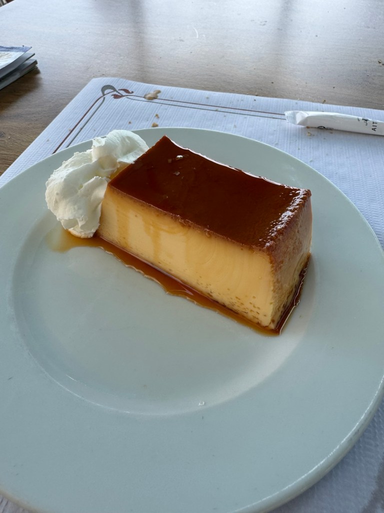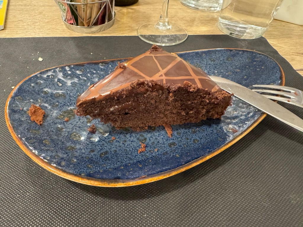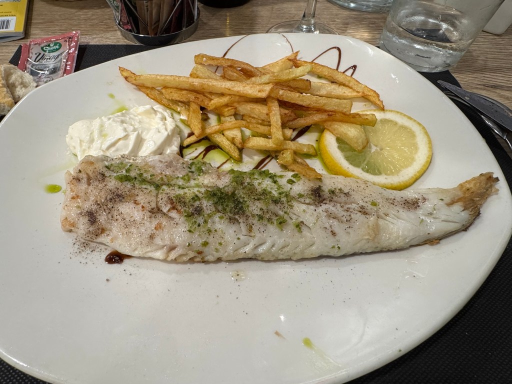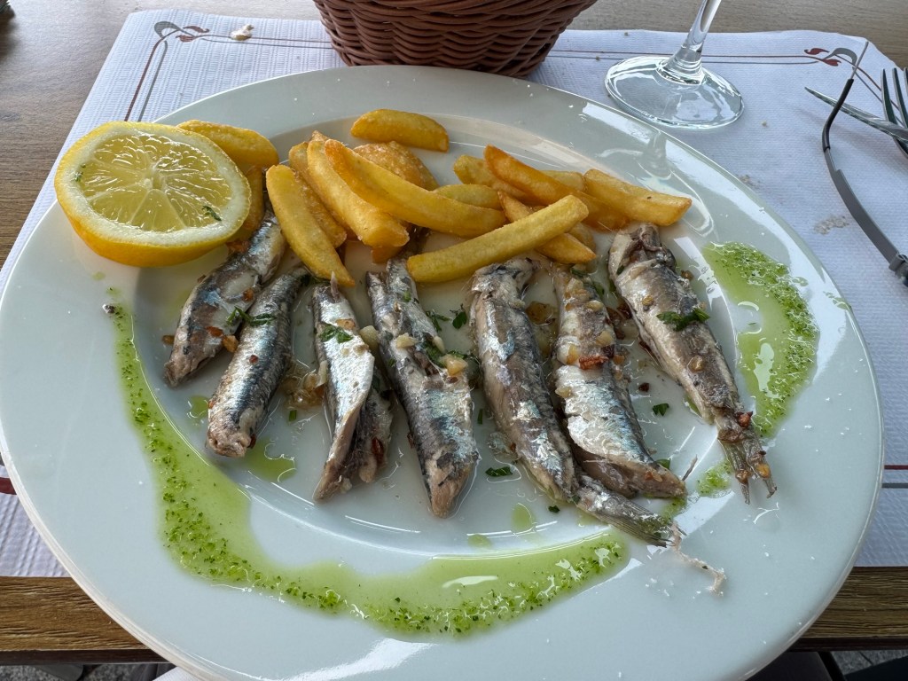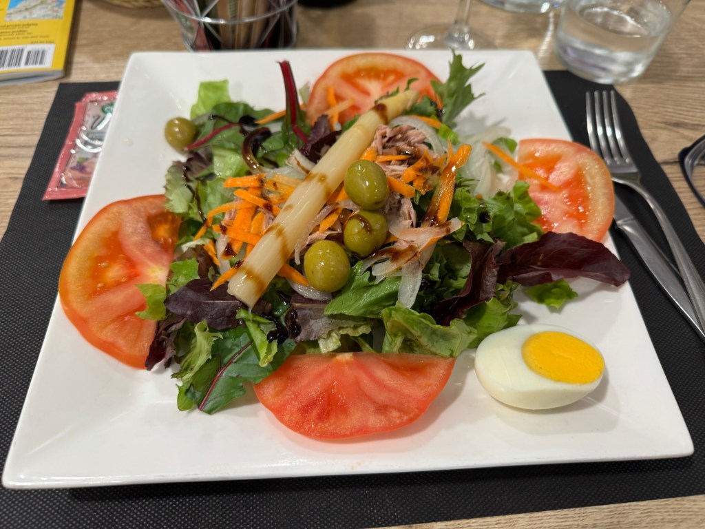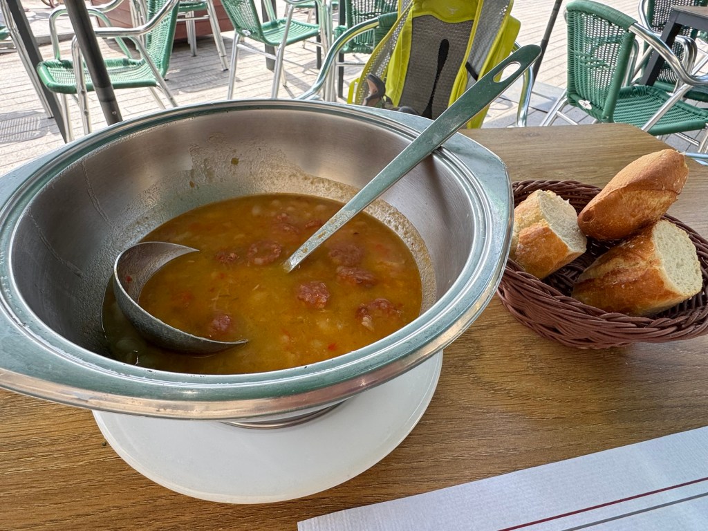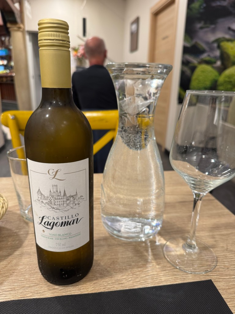 Although today’s walk was easier than yesterday, my legs were pretty sore at the end because of the ups and downs of the past two days. Three more challenging stages await. In the meantime, I relaxed through a three course dinner that included a bottle of wine. I shared the last quarter of the bottle with a diner a few tables away. It was a light white wine at 10% but it paired well with the choices I had made — 18 Euros.