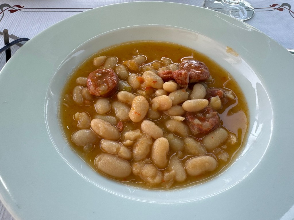 It was 1:30 when I arrived at Orio’s plaza major. Tables at all but one restaurant were taken. Lucky for me. An 18 euro lunch menu was offered: bean soup (a tureen that yielded three bowls), grilled anchovies, flan and a glass of vino. All that I could ask for —- and for the price! Sitting under an umbrella by the river was heavenly.