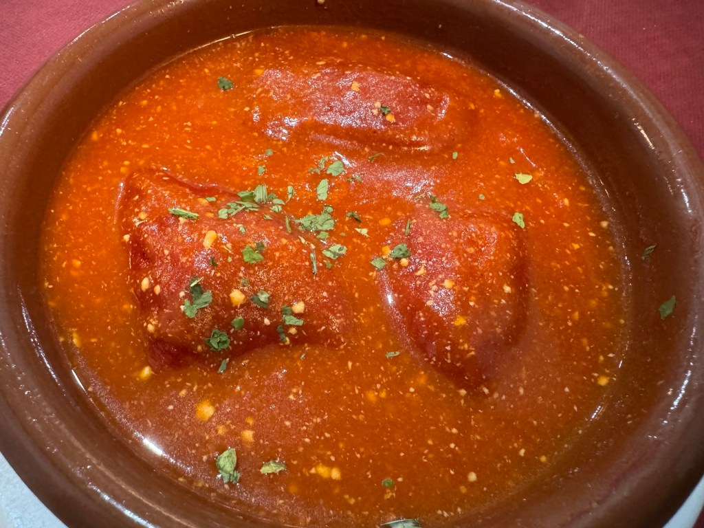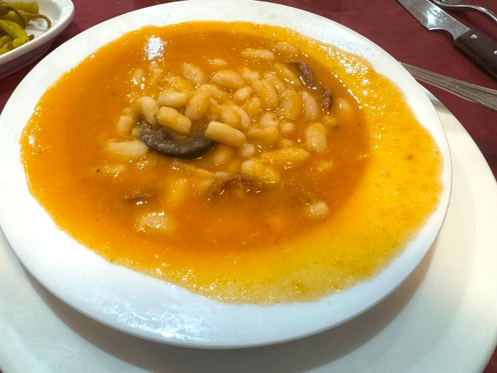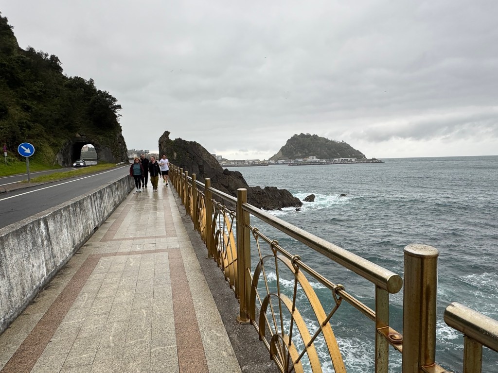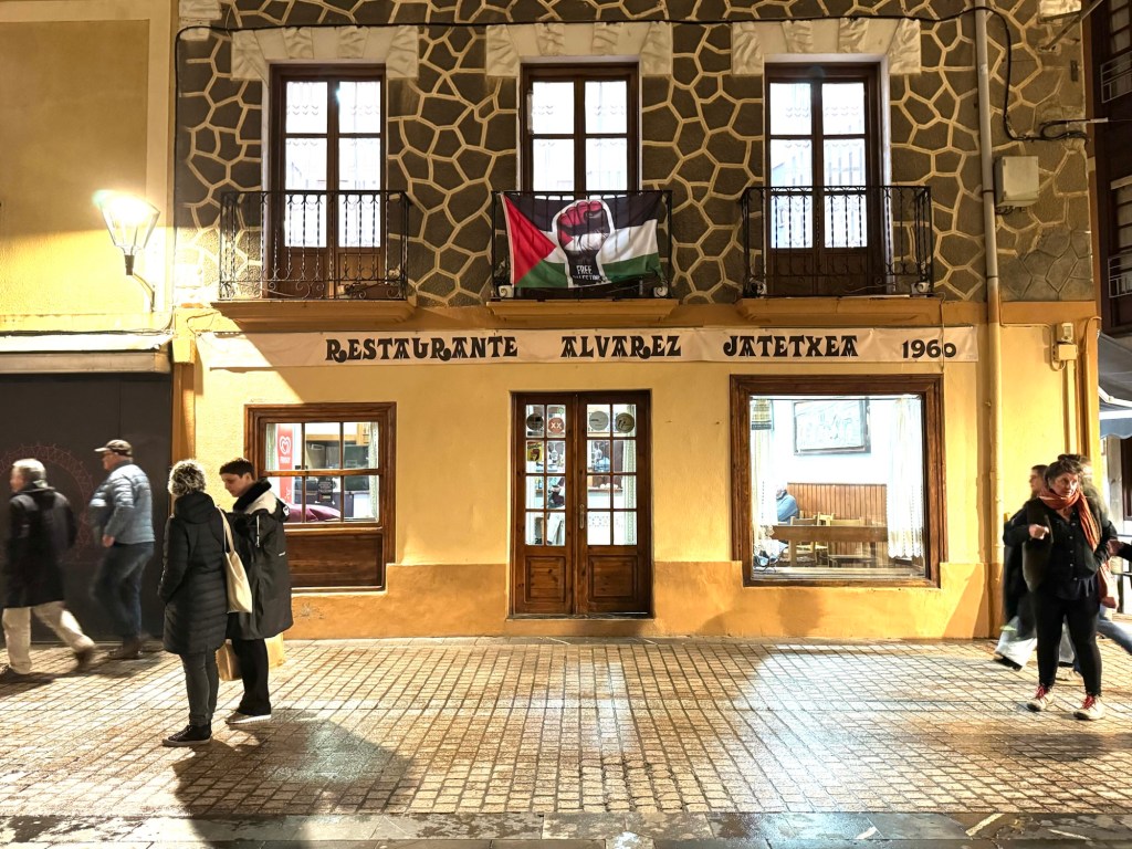 The rain stopped by 8:00 PM. I was hungry. I ended the day with a hearty meal of meal of bean soup (not again!), red peppers, and chocolate cake. I include an image of the restaurant and the Palestinian flag above its windows. I am in Basque land whose people have sought independence from Spain for centuries — sometimes violently. I saw more Palestinian flags during the past four days than those of the Basque football club (Reala) who will be playing in the Copa del Rey (the championship of all Spanish football clubs) this coming week. If you watched Ted Lasso, you will know how big of a deal loyalty to your football club is.