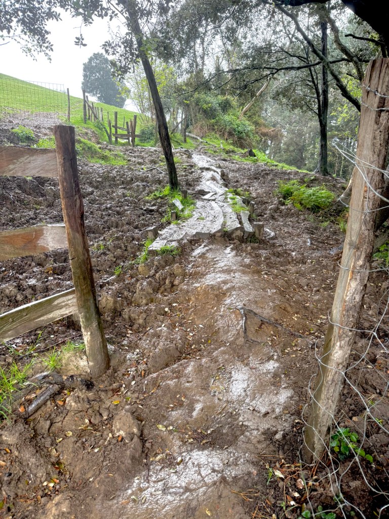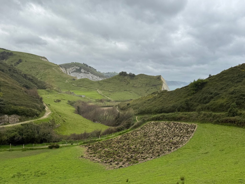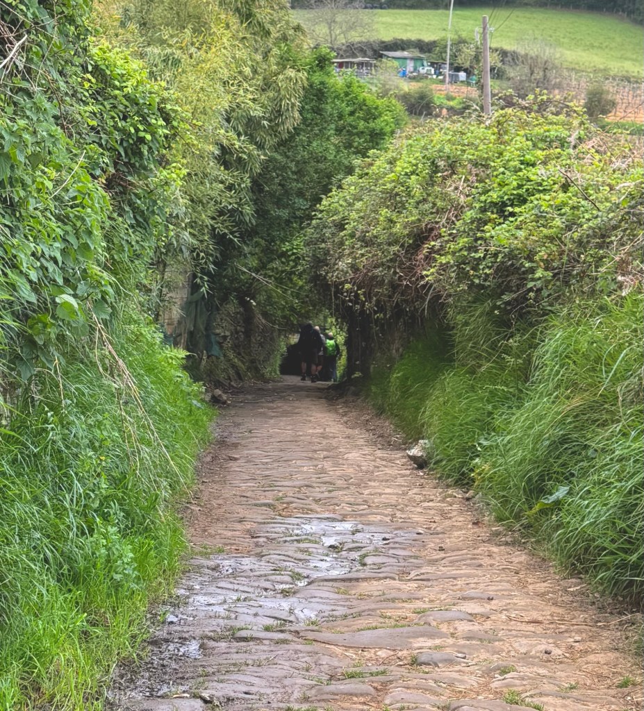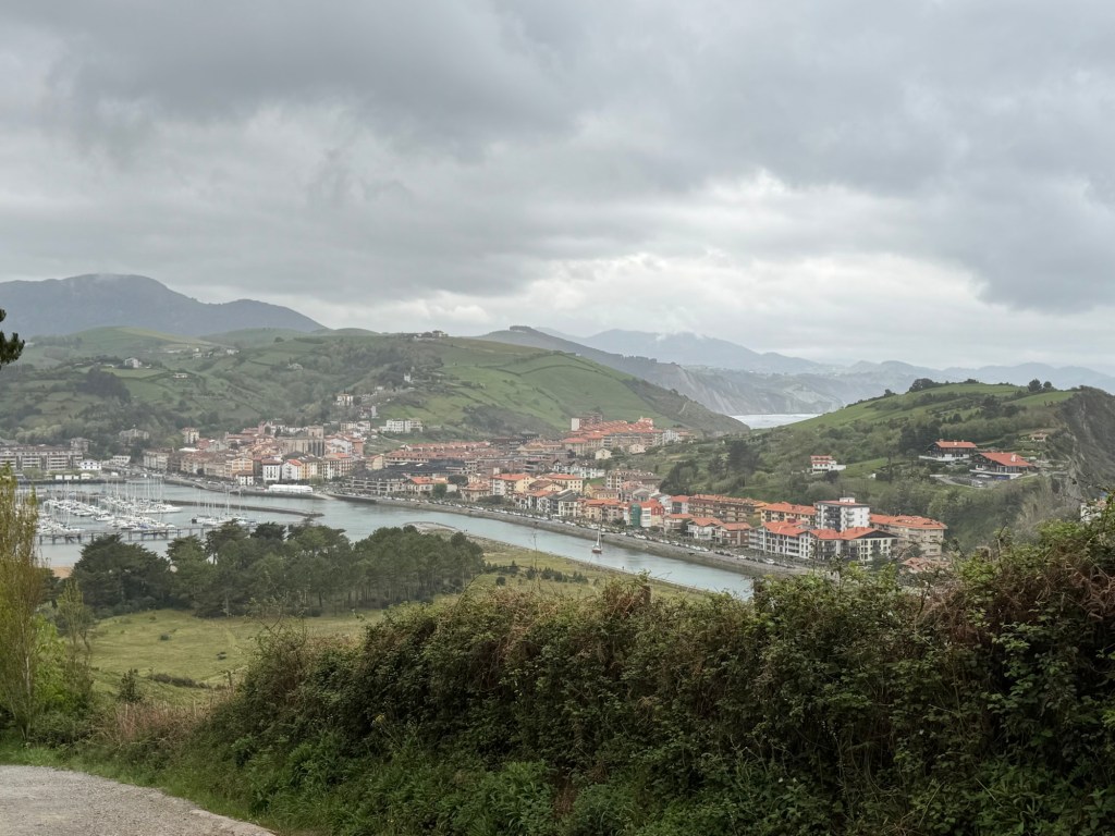 After climbing away from the Flysch, the rains came. Remember the Morton salt slogan? “When it rains, it pours.” For the next three hours, I made my way to Deba on muddy paths. I did stop for directions to Deba at a bar/restaurant and for some food and cafe con leche. I also met one of Rhubie’s cousins.