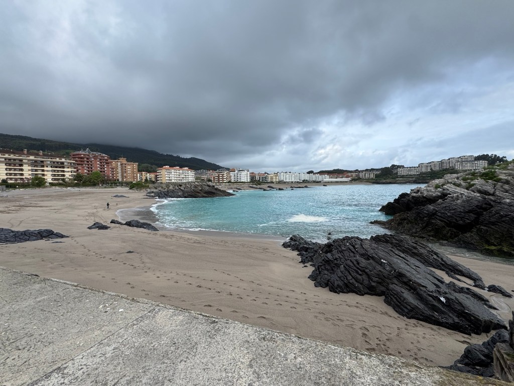 The colors and ruggedness of the beach stood out in the early morning sun. About 2 miles out of town, I looked back on the coastline. In the far distance was the mountain that framed Pobeña.