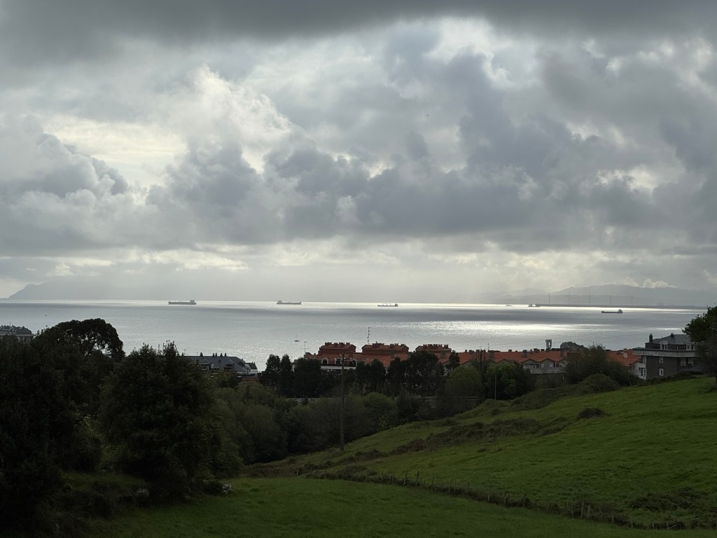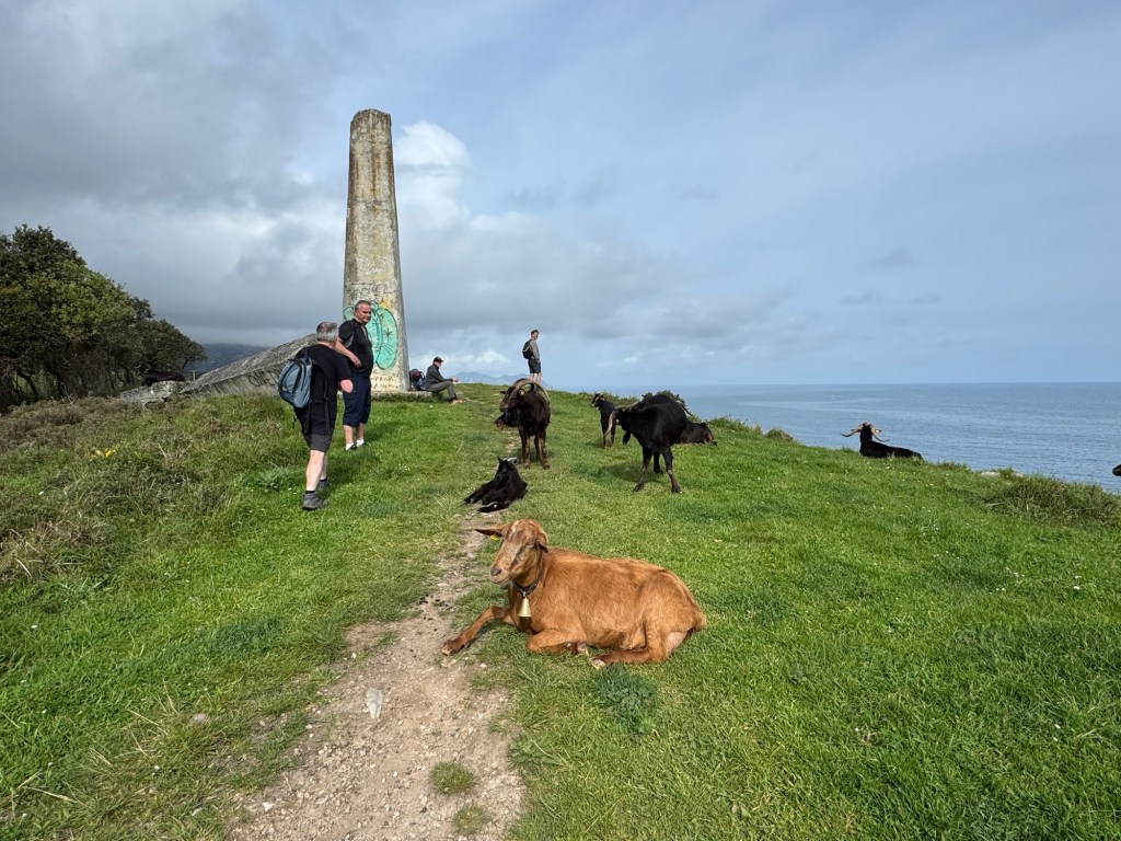 The Camino del Norte goes along a fairly flat trail on low cliffs. We shared the grounds around a monument to what or whom I don’t know with a herd of goats — all were black except for one. They were non-plussed when we came upon them. Just some humans treading into their space.