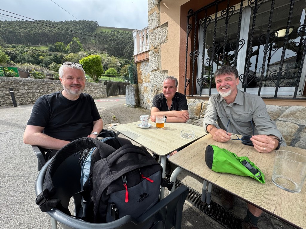 We were at the one-third mark and approaching 11:30. Conveniently, we were entering Islares where we stopped for cerveza and tapas (note: we are longer in Basque Country where the correct term for small plate items is pintxos). I shared a table with three Irishmen from Cork, Ireland. They were on their first Camino. Paul talked about doing a Camino for several years. He finally decided to stop the talk and do the walk. He invited his brother-in-law John and friend, Alan. Paul told me that he was going on Camino alone if no one came along. The Three Amigos, they said. I added plus one. They are using the same tour organizer as I am — Camino Ways.