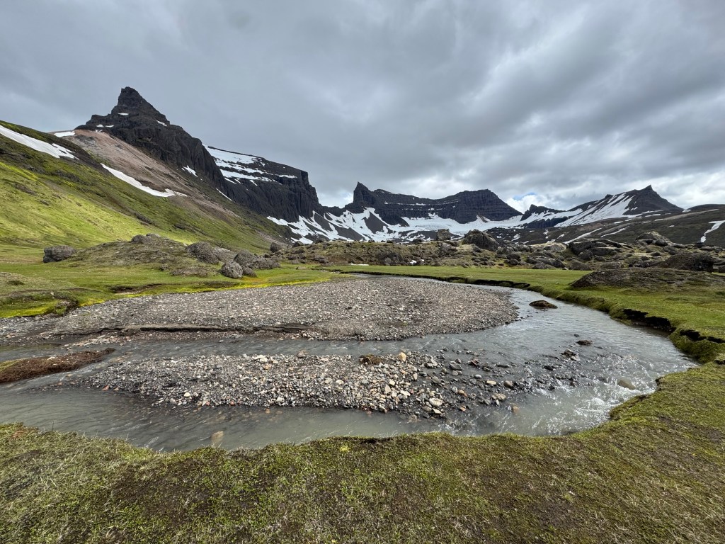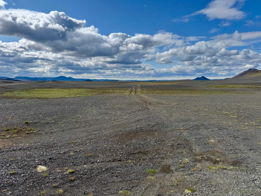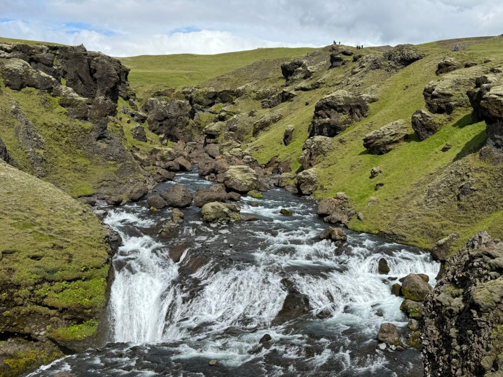 We were off to the highlands as Herdis called the interior of Southern Iceland. We turned right from Route #1 and were soon on a gravel road. In the US, we might use the term — washboard — to describe a rough road. I thought that wash cycle in a front loader would be a more appropriate phrase given the twists and turns that we experienced even at the slowest speed. Here is another image of our vehicle after we had crossed this stream. During the day, we would cross at least thirty more.
