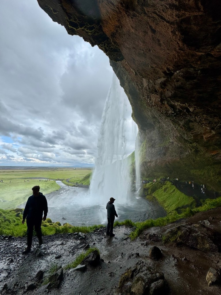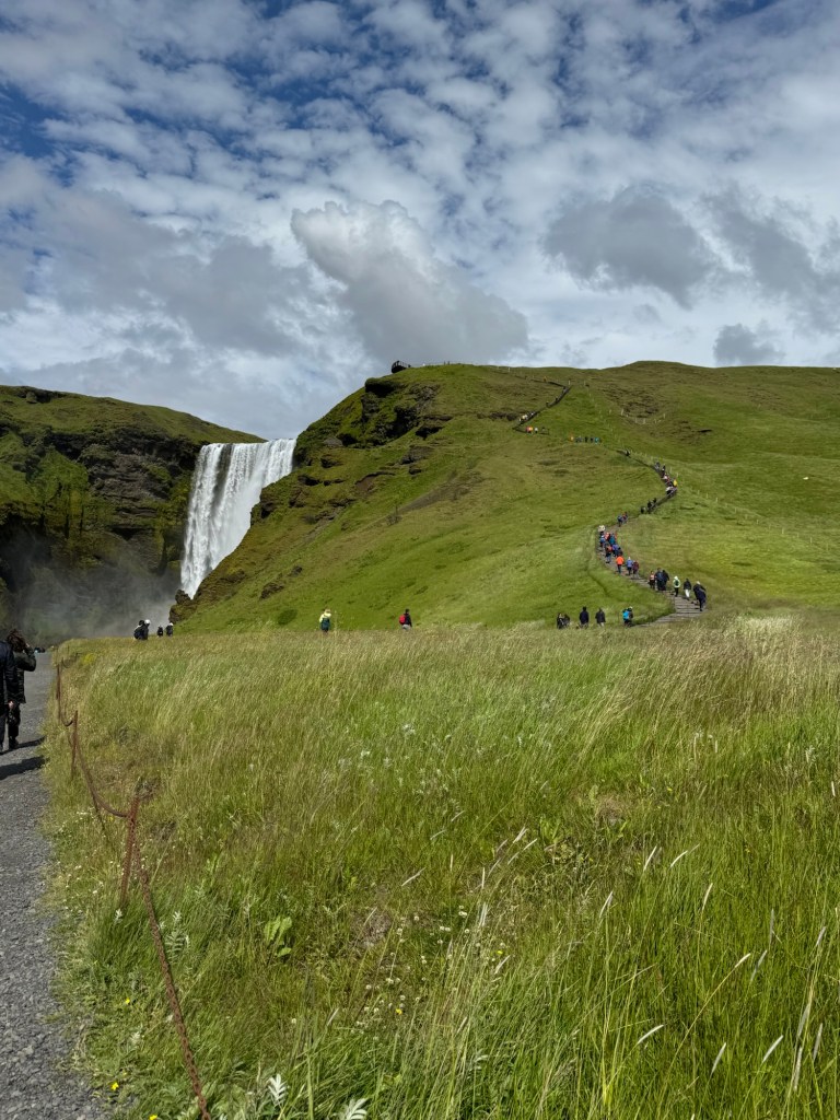 We arrived at Eldgja, a long valley within which was waterfall #152, Ofaurofuss, which once graced the cover of travel brochures for Iceland. This waterfall certainly is dramatic and stunning. Its distinctive natural arch that spanned the midline of the falls fell a decade or so before. Off the covers. I was saddened by this story because we all age and change. But alas, like Ofaeorfoss, people tend to dismiss the beauty that still remains. We climbed to the metal lookout platform where the natural arch once spanned the falls. Judge for yourselves.