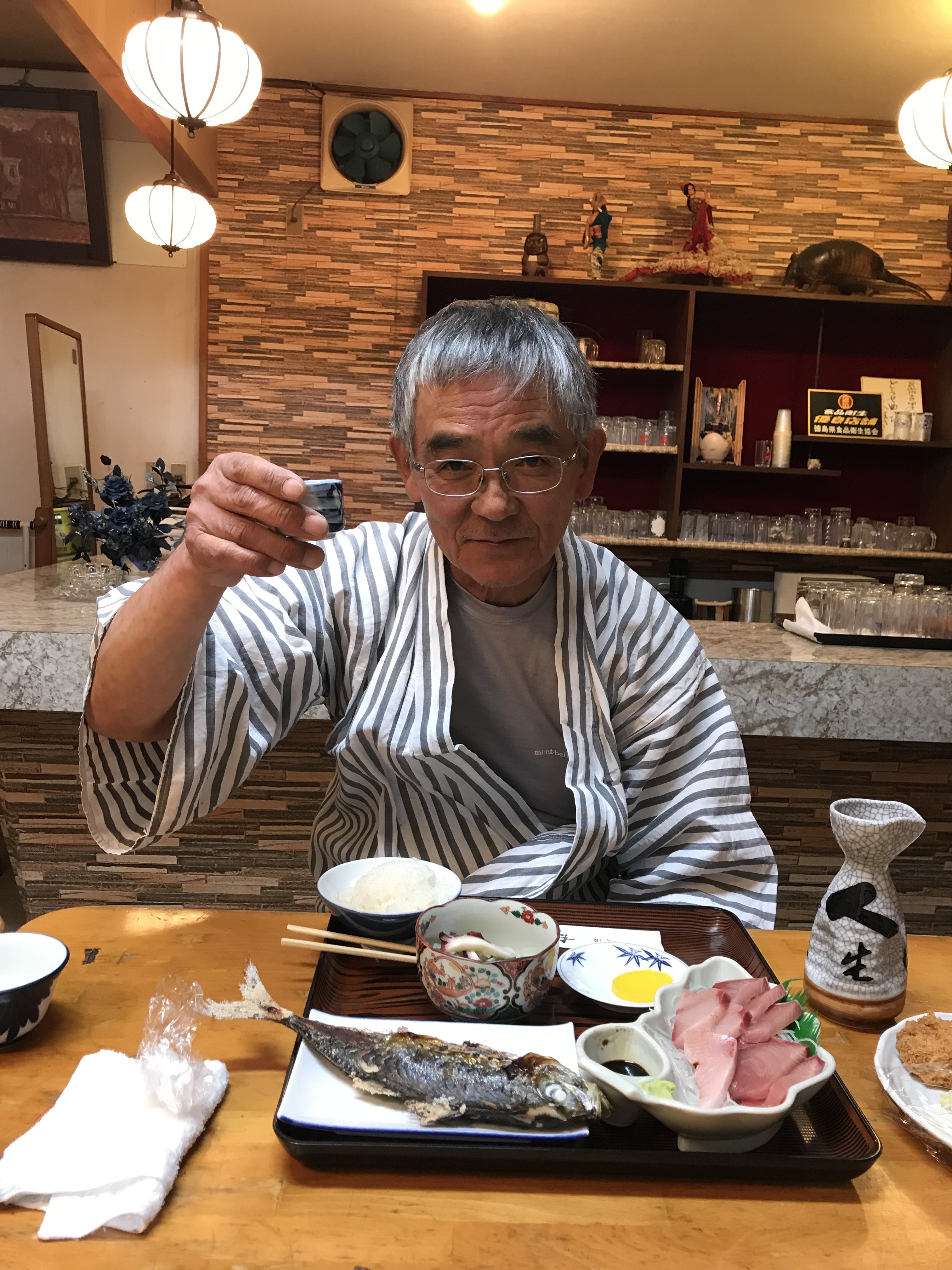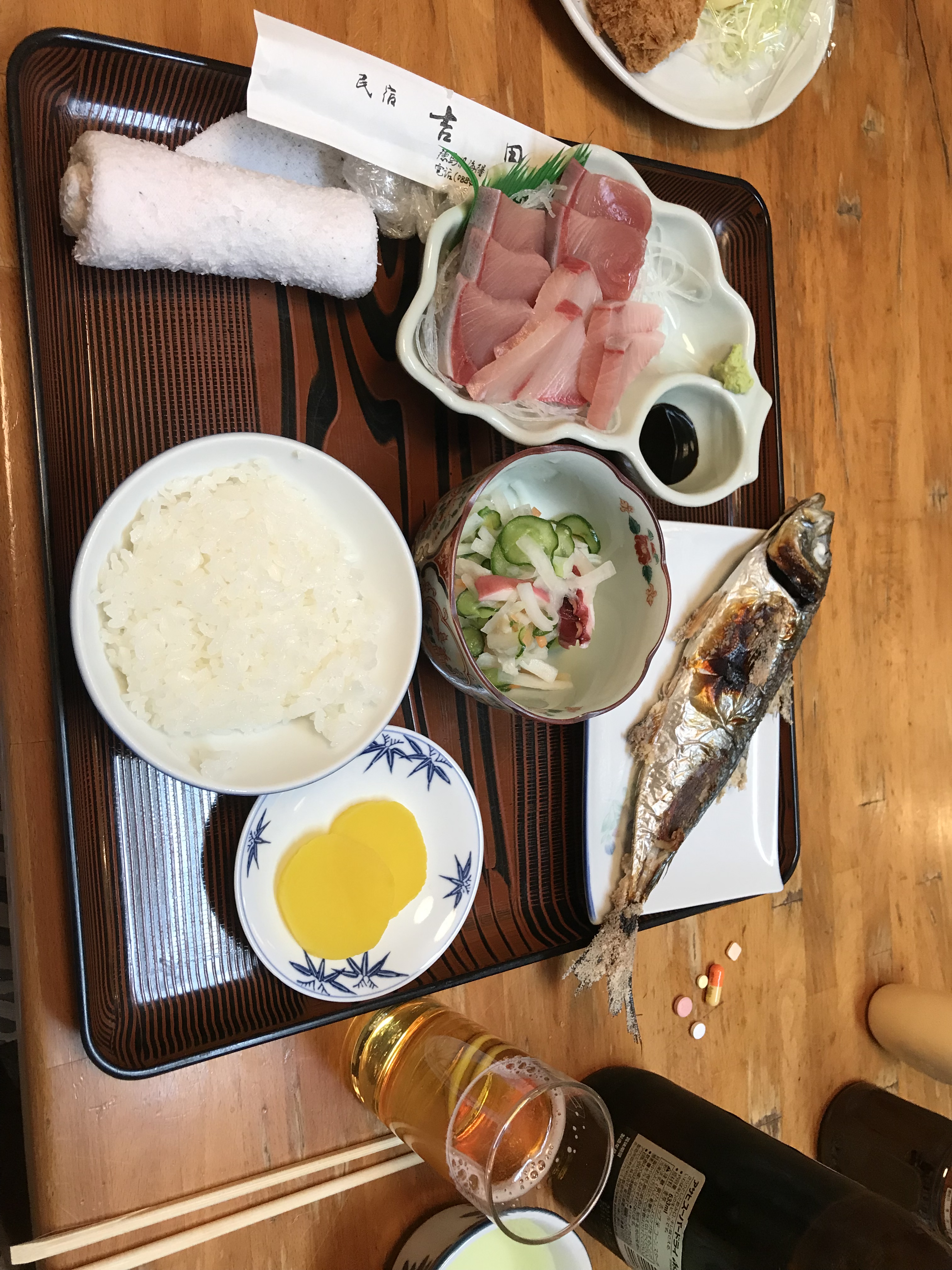 Minshuku is a family owned and operated business. Micchan started hers decades ago to support herself and her children after her husband died while commercially fishing. Renowned after a review in the prestigious Asahi Shinbun, she provides well appointed Japanese styled rooms and of course dinner and breakfast. Pictured below are some dishes that she prepared for us. Loved the grilled fish and sashimi. Both locally caught.