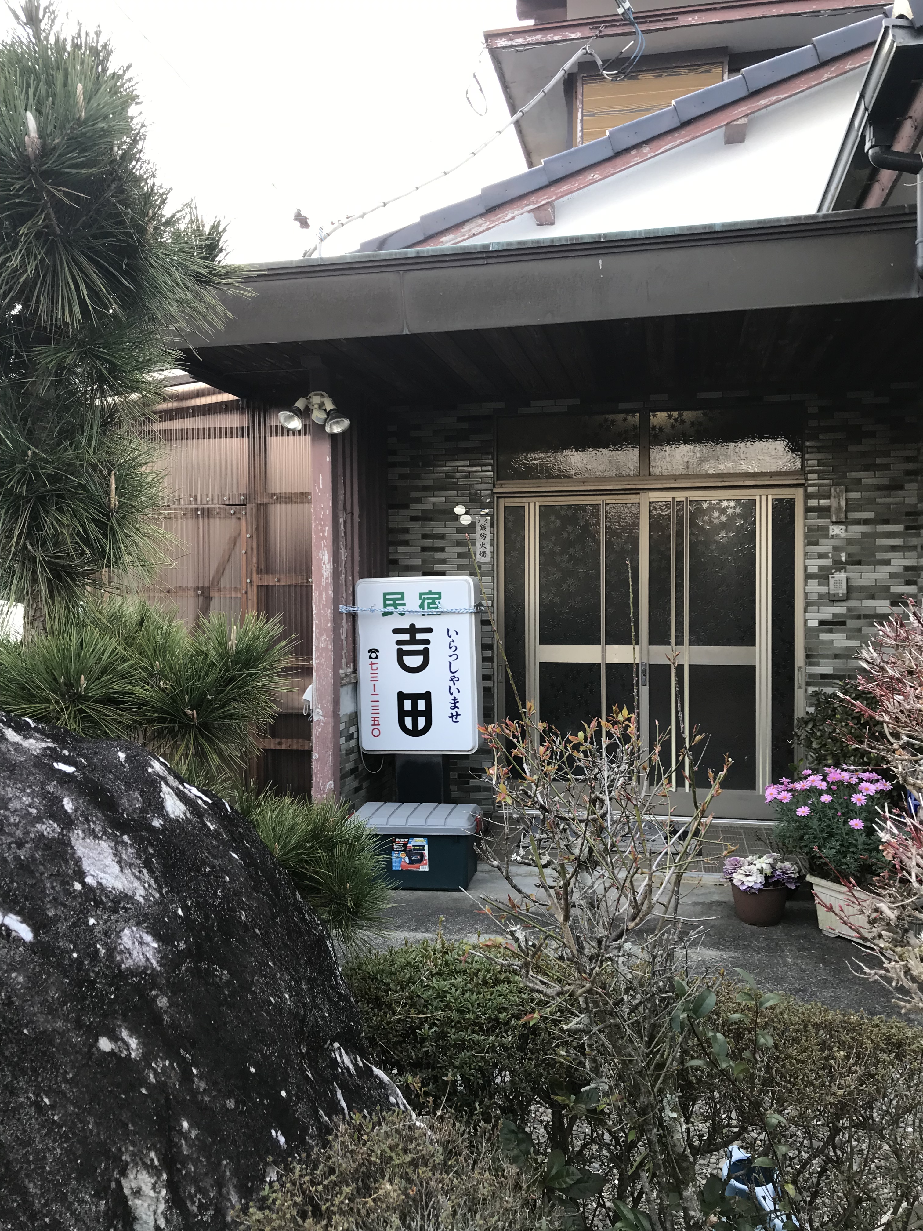 I was getting tired. Luckily, I recognized her name written in hiragana. As I walked down to her village, I thought of the morning climb up. Here is her name above the entry to her minshuku.