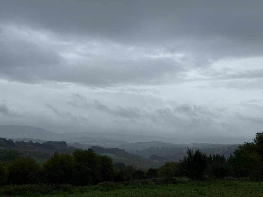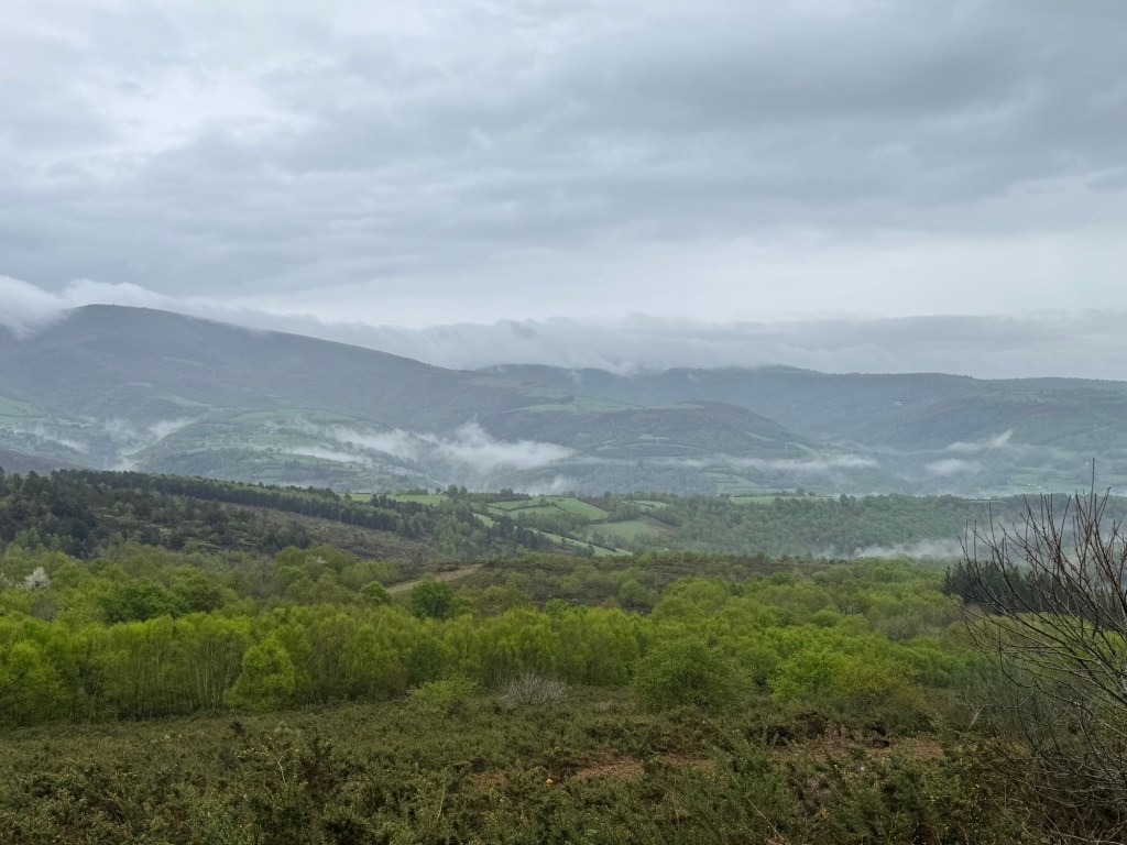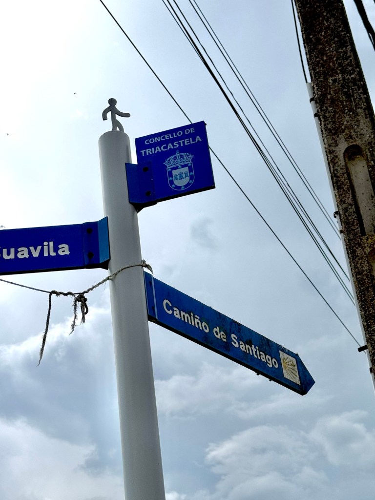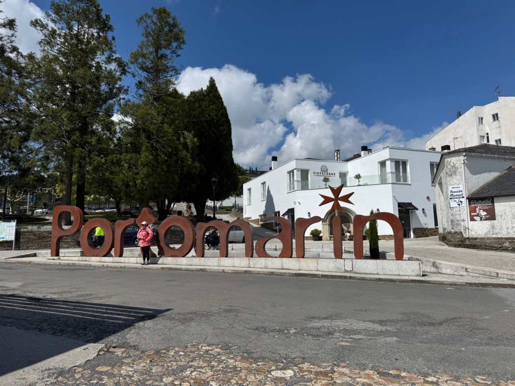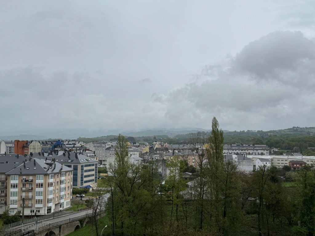 After making the last check of my room, I looked out the window. Just in the middle of town (Palas de Rei) was a partial rainbow. You know what that means — rain. On went the rain pants and I adjusted my planned walk to all out because the sky was full with rain clouds.