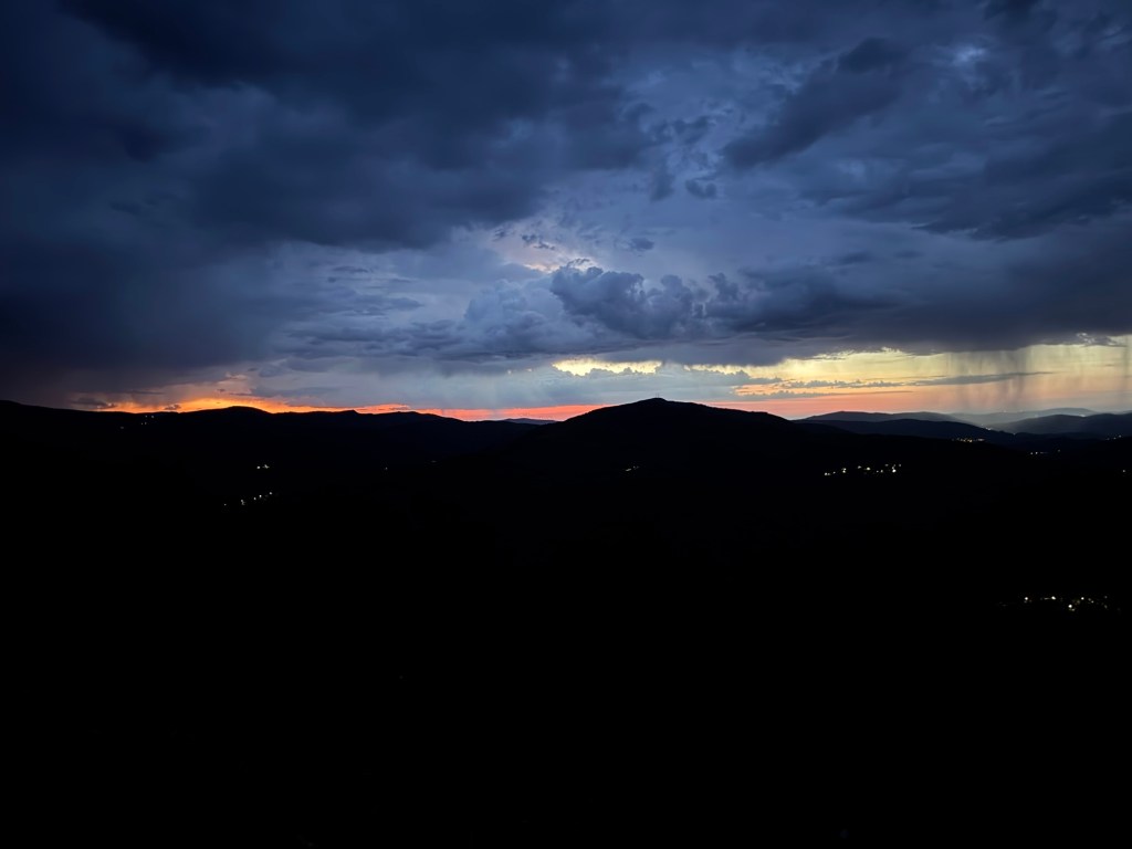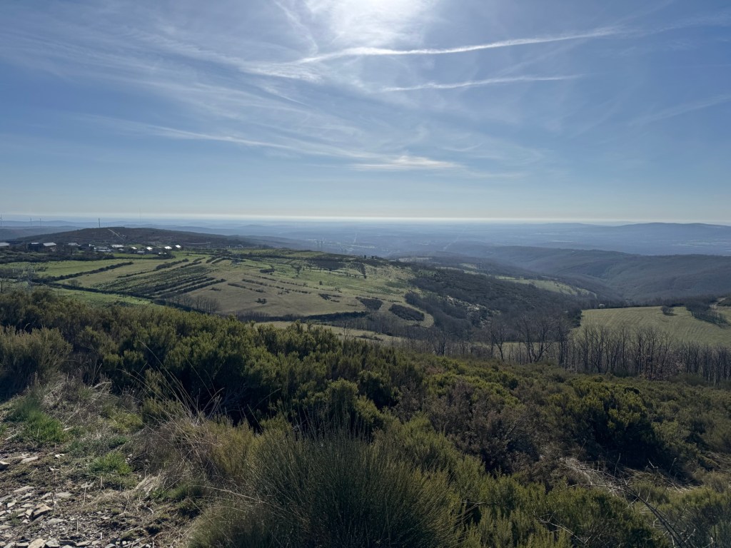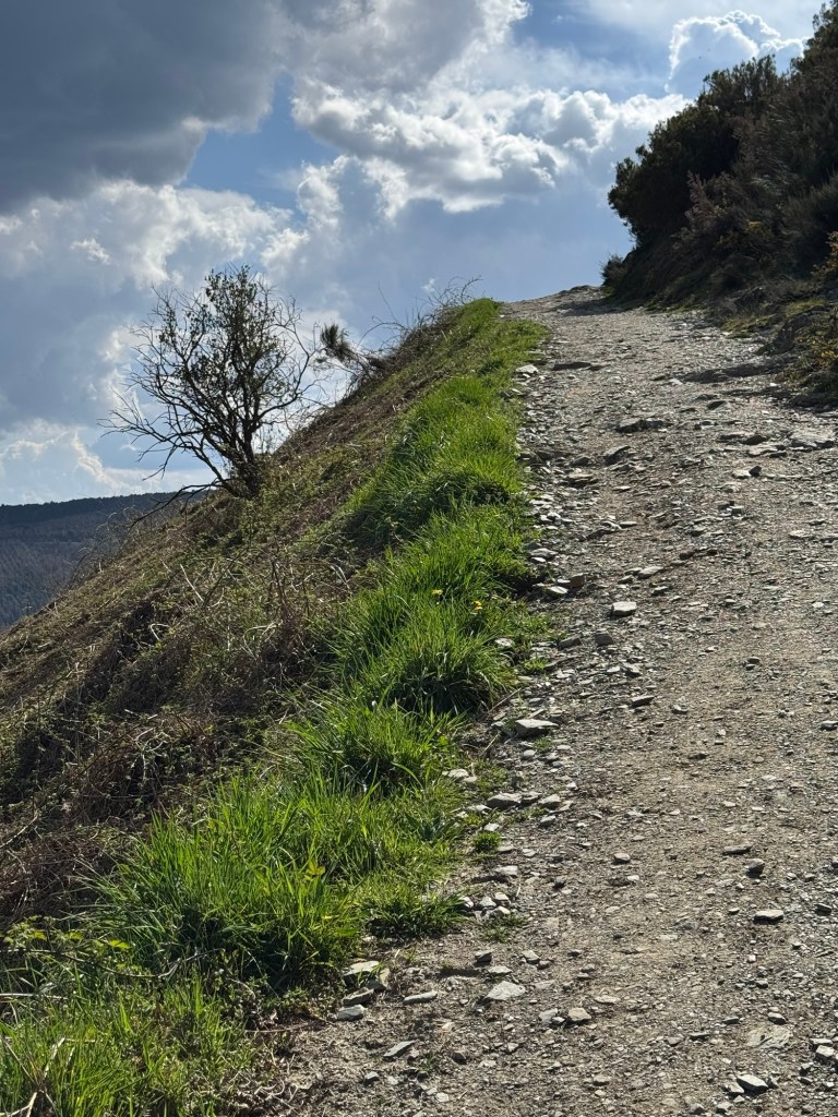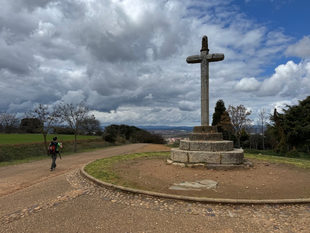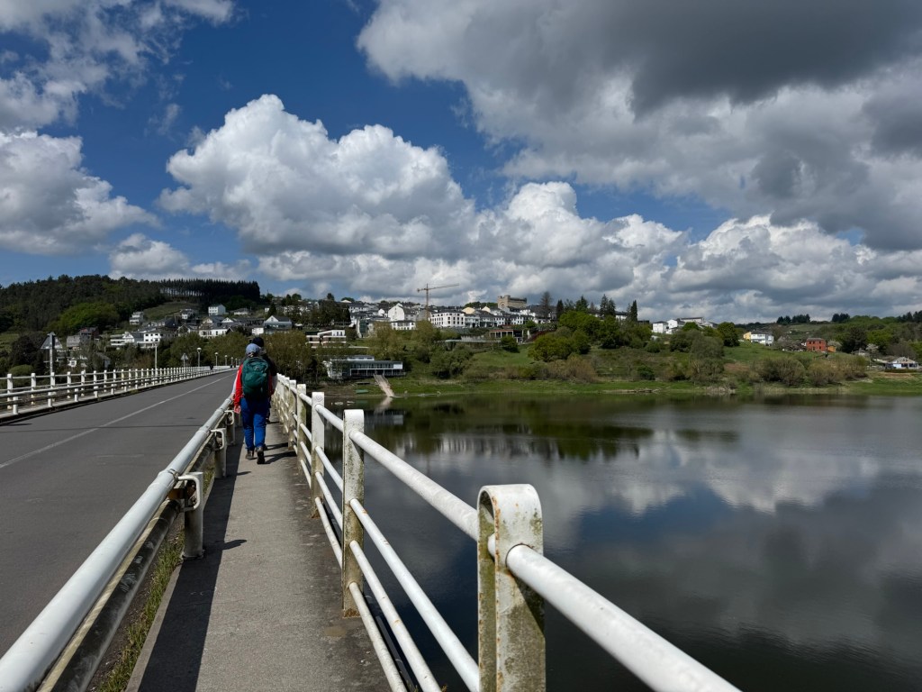 After making the last check of my room, I looked out the window. Just in the middle of town (Palas de Rei) was a partial rainbow. You know what that means — rain. On went the rain pants and I adjusted my planned walk to all out because the sky was full with rain clouds.