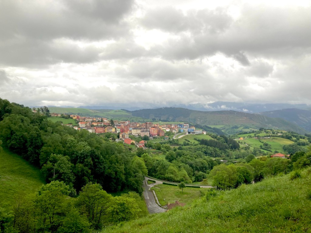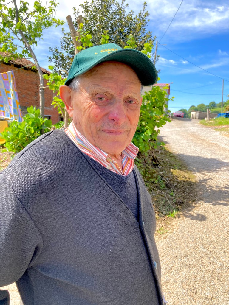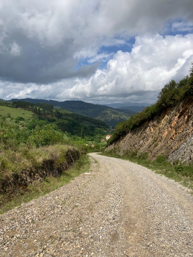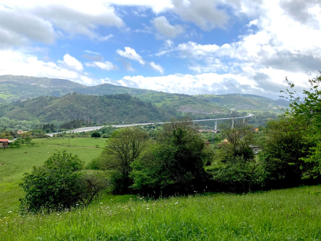 The countryside was beautiful. However, photos can’t directly convey the sounds of birds, the earthy smells of farms, or the sensations of wind against one’s body. The air is fresh; cars and trucks are few. After four hours, I came upon route signs: Tineo to the left and Pola to right. Alas, I was still less than halfway to Pola.