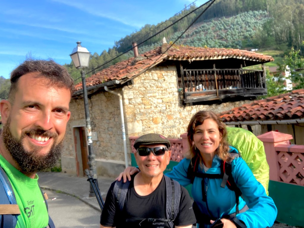 The walk started at 8:15 AM and ended at 6:45 PM making it as long as some of the high mountain climbs I did in Japan. The morning started as rain but it was light. I wasn’t soaked and the large rocks on the paths were not slippery — the good news. The bad news was that mud was everywhere making Camino walkers dodge sideways to avoid our shoes getting wet. Nature was merciful today and a makeshift sign on the road out of Tineo expressed a wonderful sentiment — Here There I am by your side. I thought of Kobo Daishi from my 88 Temple walk.
