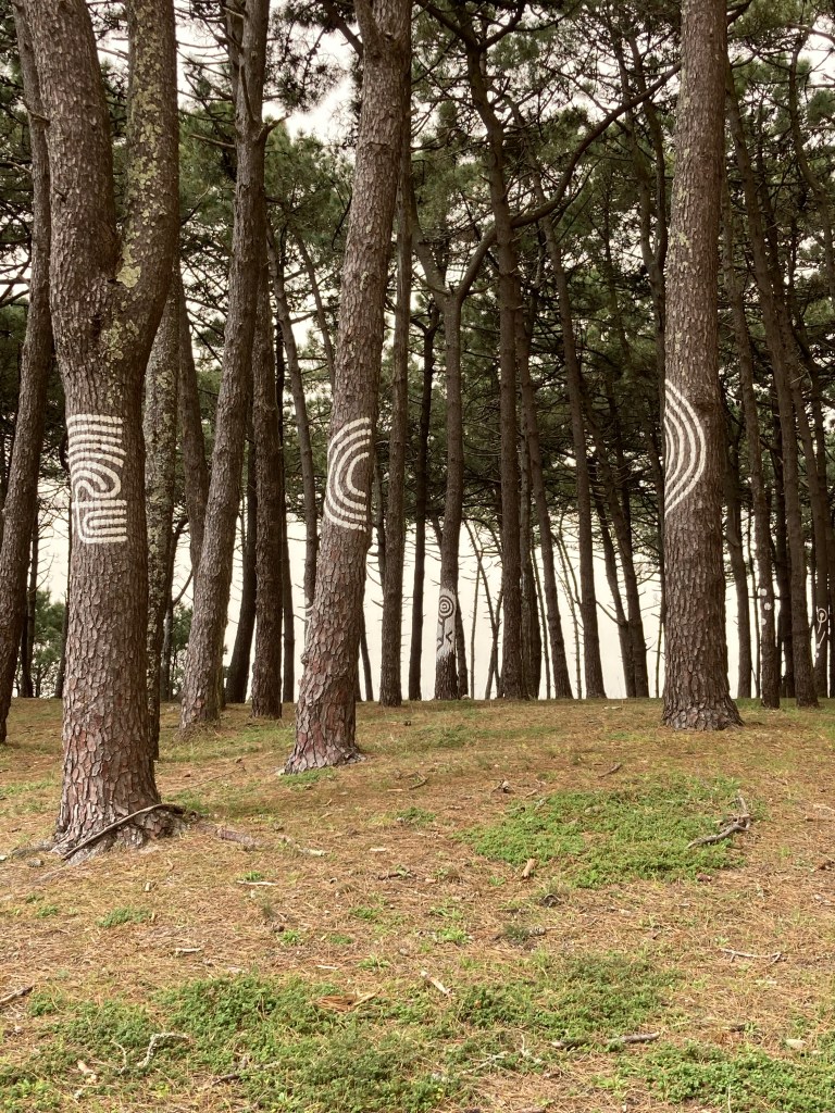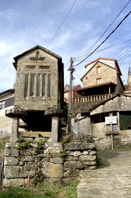 We were under 15 miles. Santiago was just over the horizon after approximately 208 miles by our count (final total) not including the ten touring Baiona on our rest day. Our first stone Galician sign was seen on Day 7 as we left A Guarda (159 km). Each day was a day but now that week seemed to be a mere blink. More than most of our daily segments, this one zigged zagged through small villages, farms, and forest. We saw many different examples of Galician granaries including one being built. In a 10 minute span, we joined several fellow pilgrims excitedly making their way to Santiago before dispersing into smaller groups traveling at their own pace. At a bend in the road, we stopped in a church in which a man stamped passports. A Xi’an warrior looked out at us – part of an international company of Camino guardians? The Pope does have his Swiss Guards.