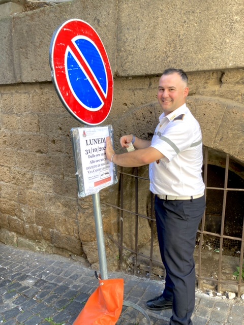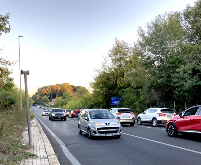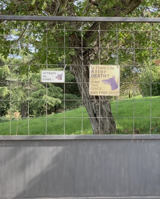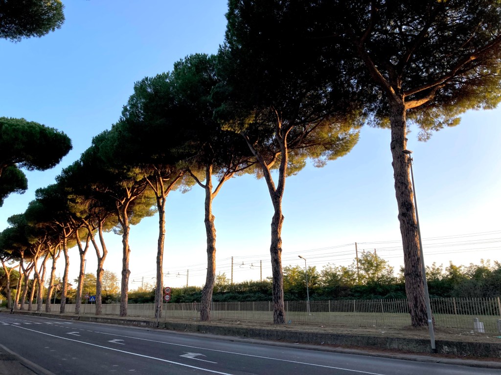 The street seems quiet but it wasn’t. Just a few moments before, a string of vehicles went by, one of them a wide body bus that seem to glide down the street coming within inches of the cars on either side of it. After many twists and turns across streets and a few roundabouts (our eyes were peeled on every sign pole, wall, and fence for VF symbols), we entered the park where we would come upon the lookout where we will have our first glimpse of St Peter’s from afar.