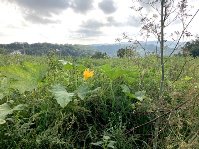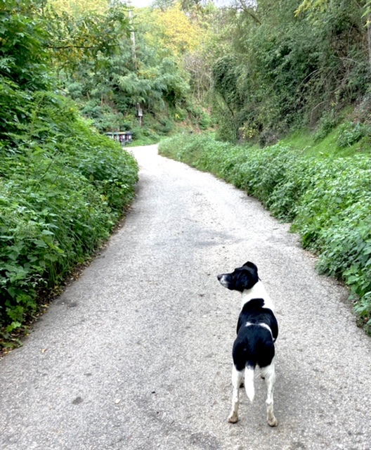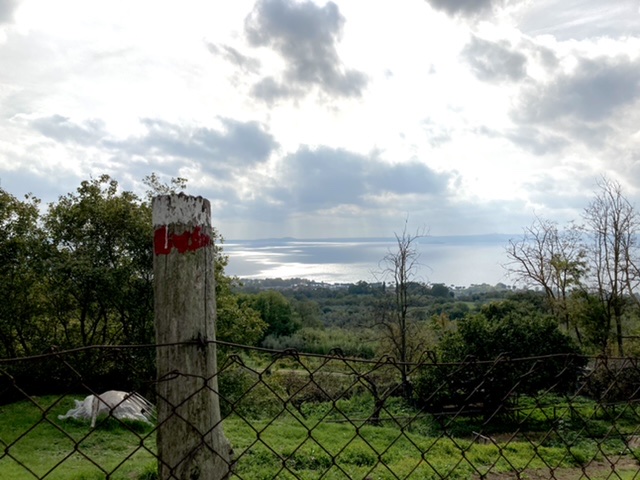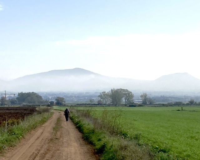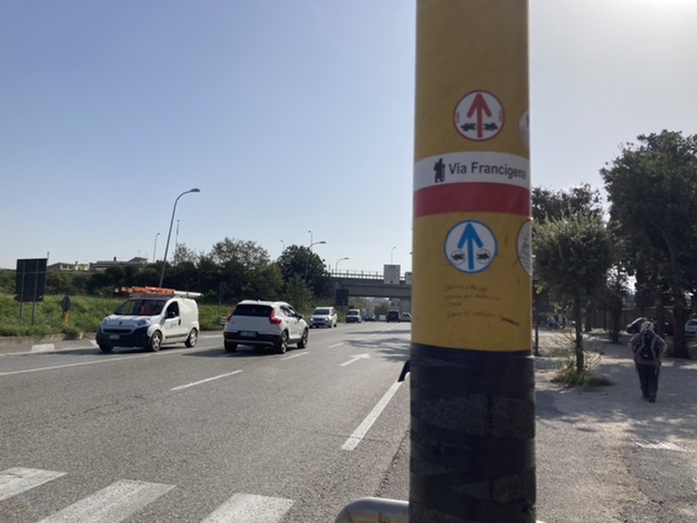 After crossing a bridge that spanned the highway encircling Rome, we fast descended into another valley of fields. This area had no homes because it was probably wetlands. We threaded our way along a narrow path for about a mile that then opened up. We had some surprise company on the trail. The shepard with his dogs moved his flock for us to pass.