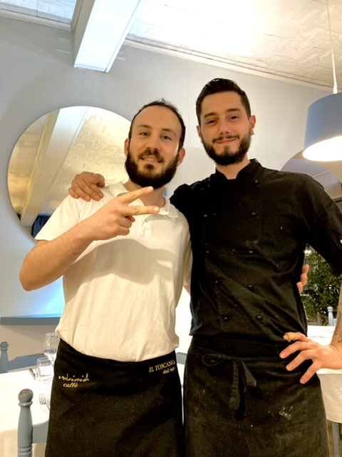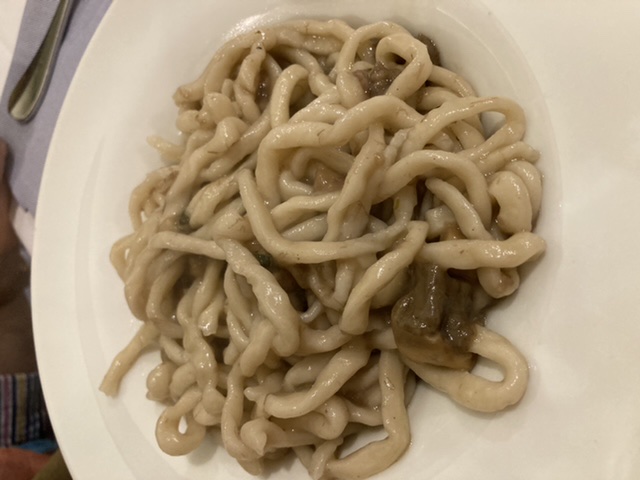 The concierge recommended a restaurant, Bottega Trattoria De Santis, a few blocks from Santa Croce. We were there by 7:15, the second table, but by 8:30, the restaurant was filled inside and out. Deservedly so. Our dishes were noteworthy: caponata, polpo with a light tomato sauce and homemade maionese (Italian spelling), beef involtini with chicory (olives and raisins as part of the sauce), and pasta of mussels and smoked pecorino. Our wine opened to reveal a richness that our bottle of the same area and style from the night before didn’t have. I also had to include a photo of the bread in the bag and the two brioche piccolo that came with the meal.