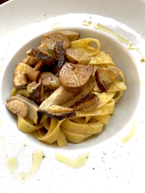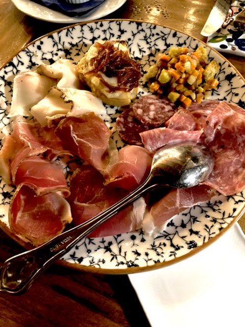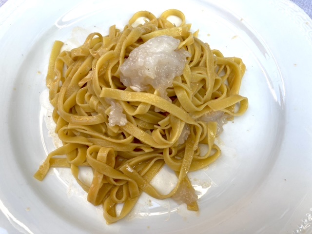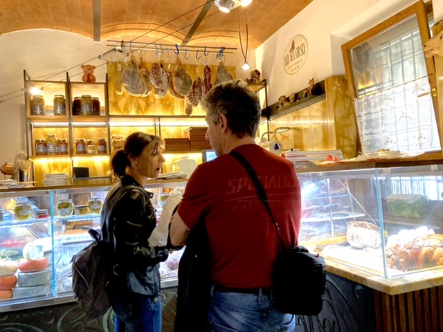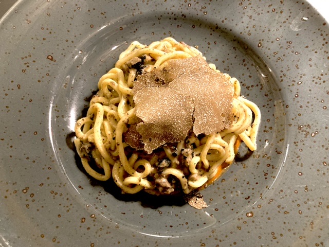 We ordered the mixed antipasti plate, and two types of pasta. Rich had the spaghetti carbonara with black truffles on top. He exclaimed — the best pasta on this trip. The key ingredient? Not the black truffles. The bacon. He vowed to replicate the dish; he said that we will bring out his pasta maker from retirement. I had the Umbrichelli pasta (similar but thinner than its Tuscan cousin, pici) topped with black truffles which was on almost every menu in Tuscany and in Orvieto. They were shaved onto the pasta at our table.