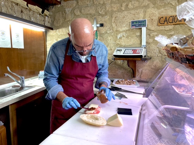 We went separate ways for our dessert. The photo of Rich’s chocolate topped ice cream says it all. I chose an Umbrian cow’s milk cheese. I am taken with how humans differ in making choices. Although so different, thumbs up for the dessert course.